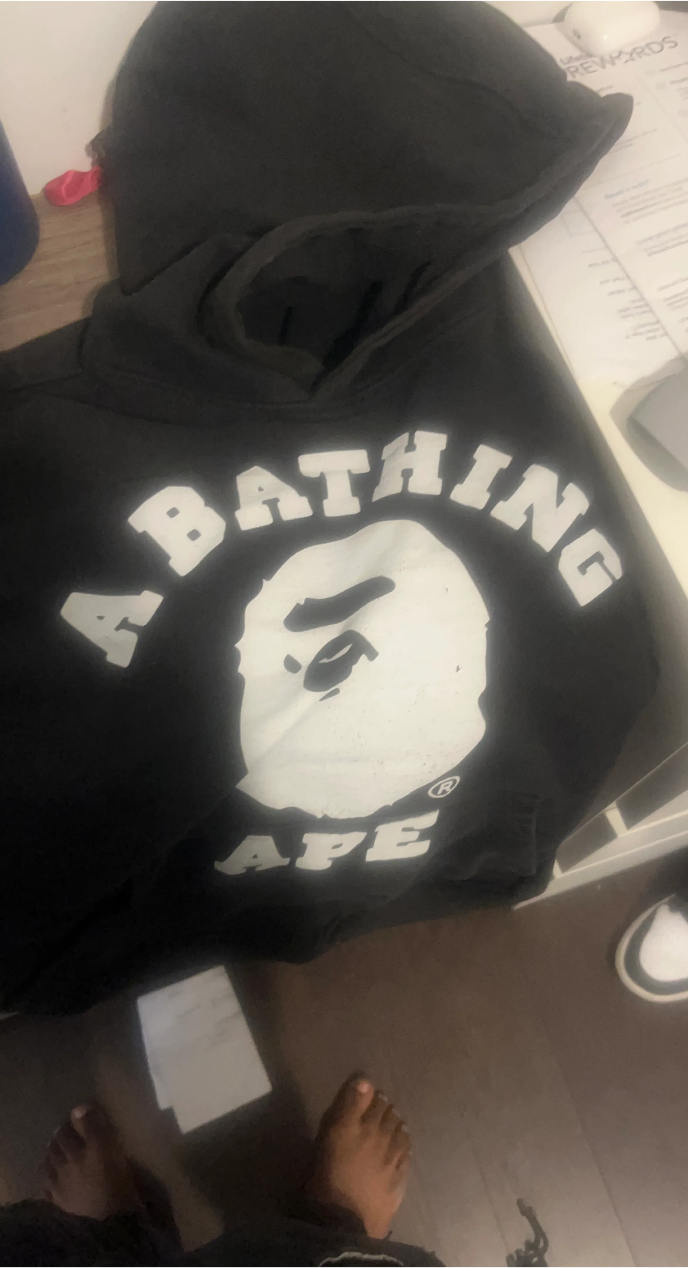 Selling a black hoodie from A Bathing Ape (BAPE). It features the iconic BAPE logo on the front. A great piece for any streetwear enthusiast!