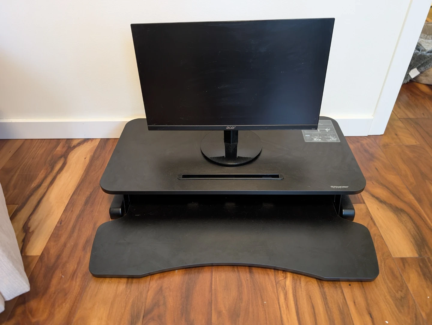 Selling an Ergonomic sit-stand desk converter in black. Like new condition and ready for a new workspace. Comes with a free 24 inch working monitor. This desk converter lets you easily switch between sitting and standing throughout the day. It's a fantastic way to add some movement to your workday!