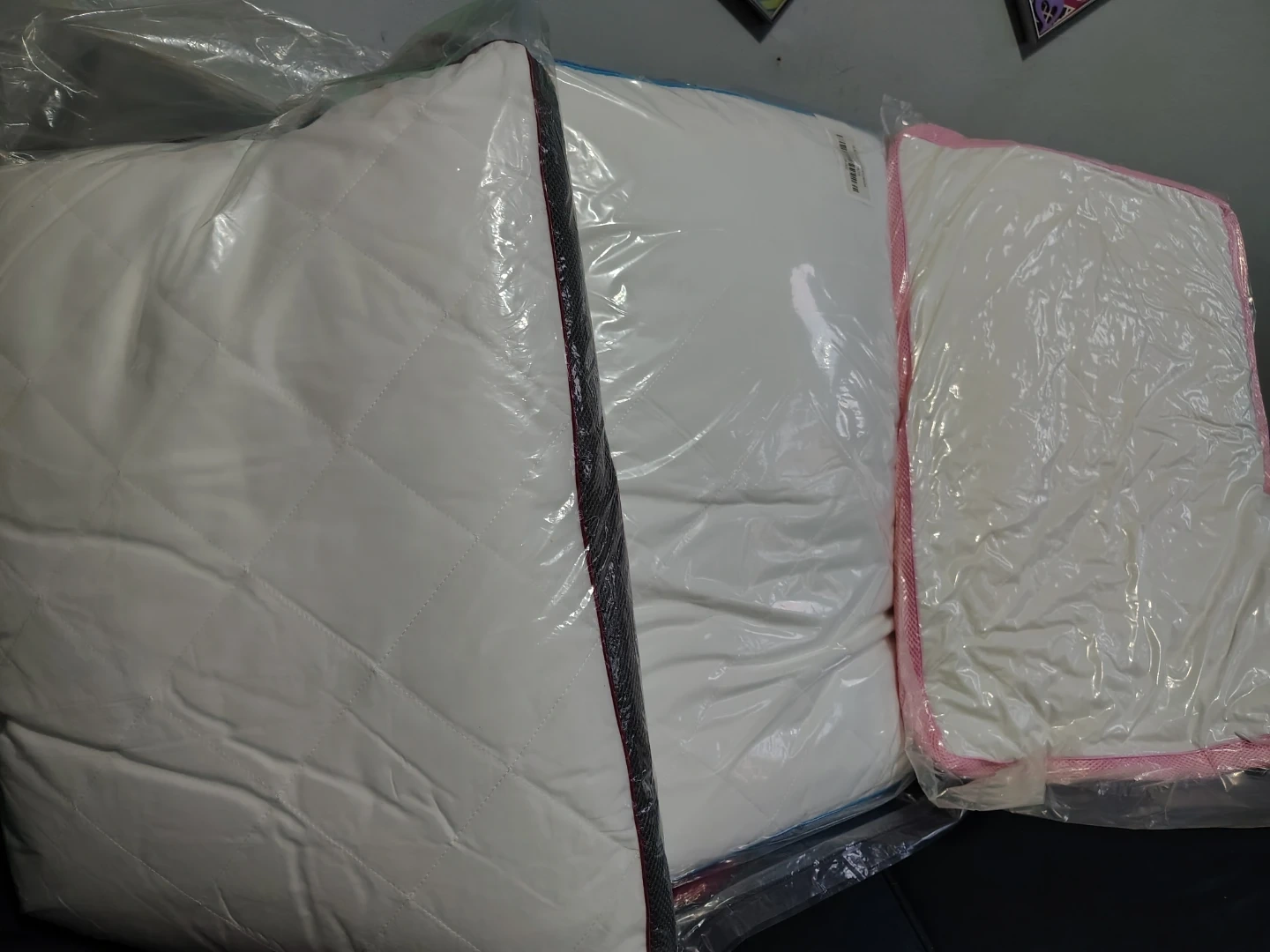 I'm selling a Comfort pillow. It's still in its original packaging. The pillow has a white quilted pattern and is trimmed with a colored edge. $15 each or 2 for 25