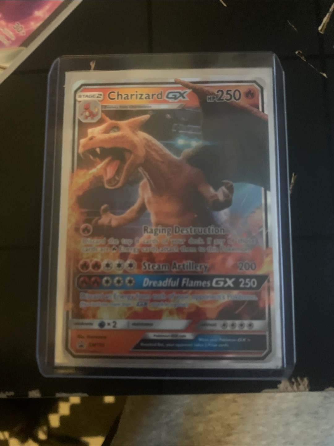 Selling a Charizard GX Pokemon card. It has 250 HP and includes the attacks Raging Destruction, Steam Artillery (200), and Dreadful Flames GX (250)