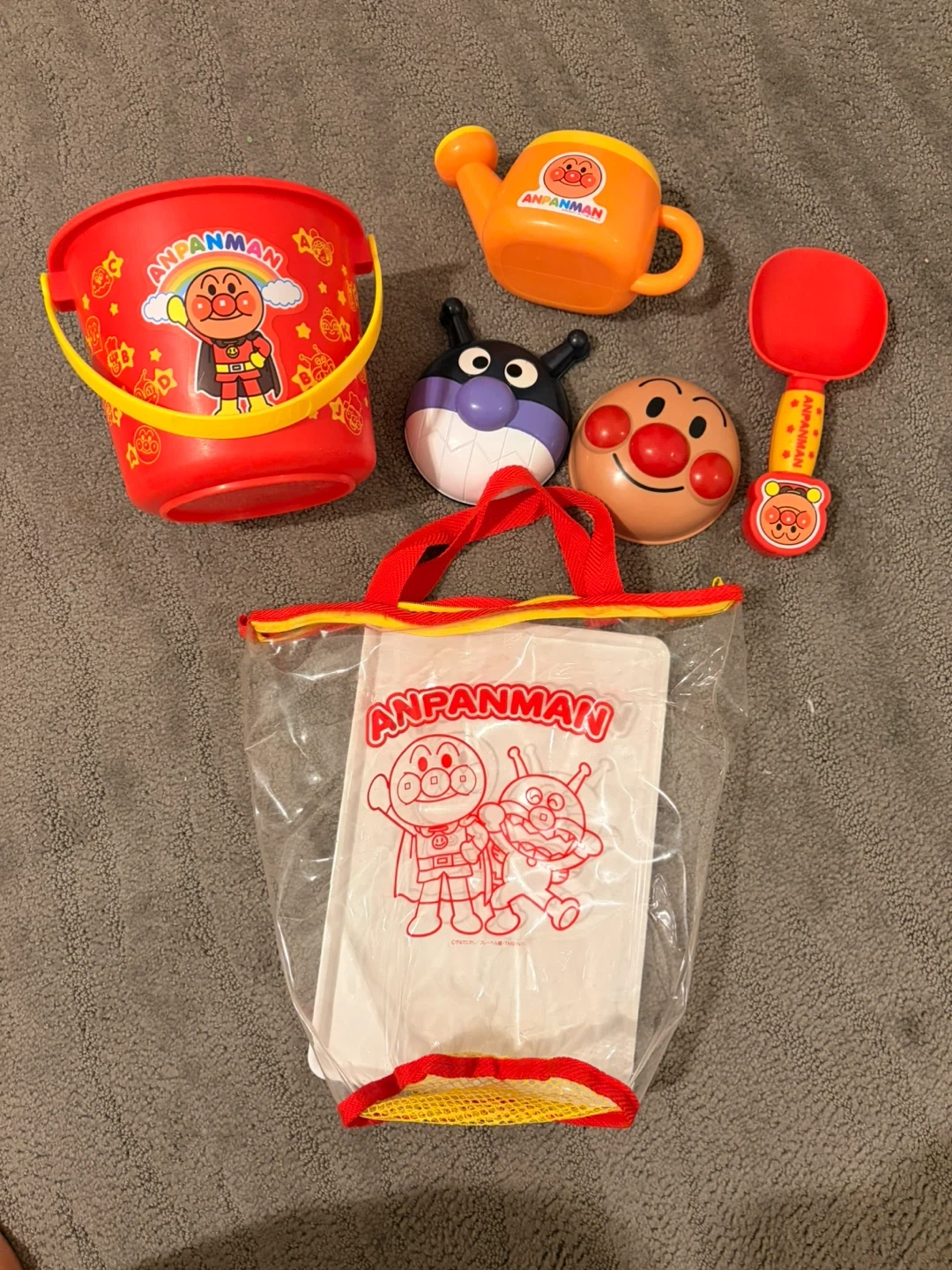 Cute Anpanman sand toy set with bucket, watering can, scoop, and character molds, all in a handy carrying bag! Perfect for fun at the beach or in the sandbox