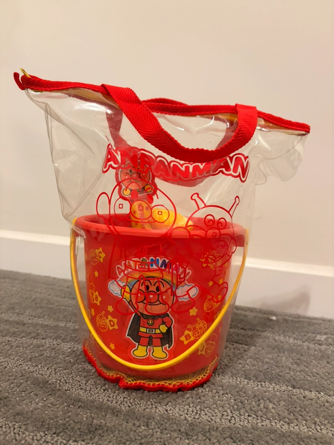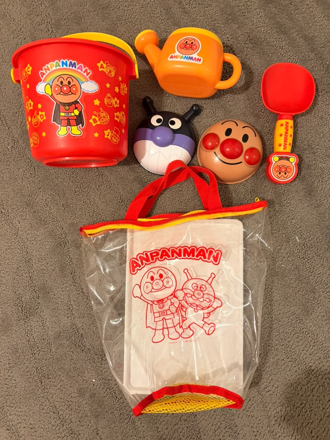 Cute Anpanman sand toy set with bucket, watering can, scoop, and character molds, all in a handy carrying bag! Perfect for fun at the beach or in the sandbox