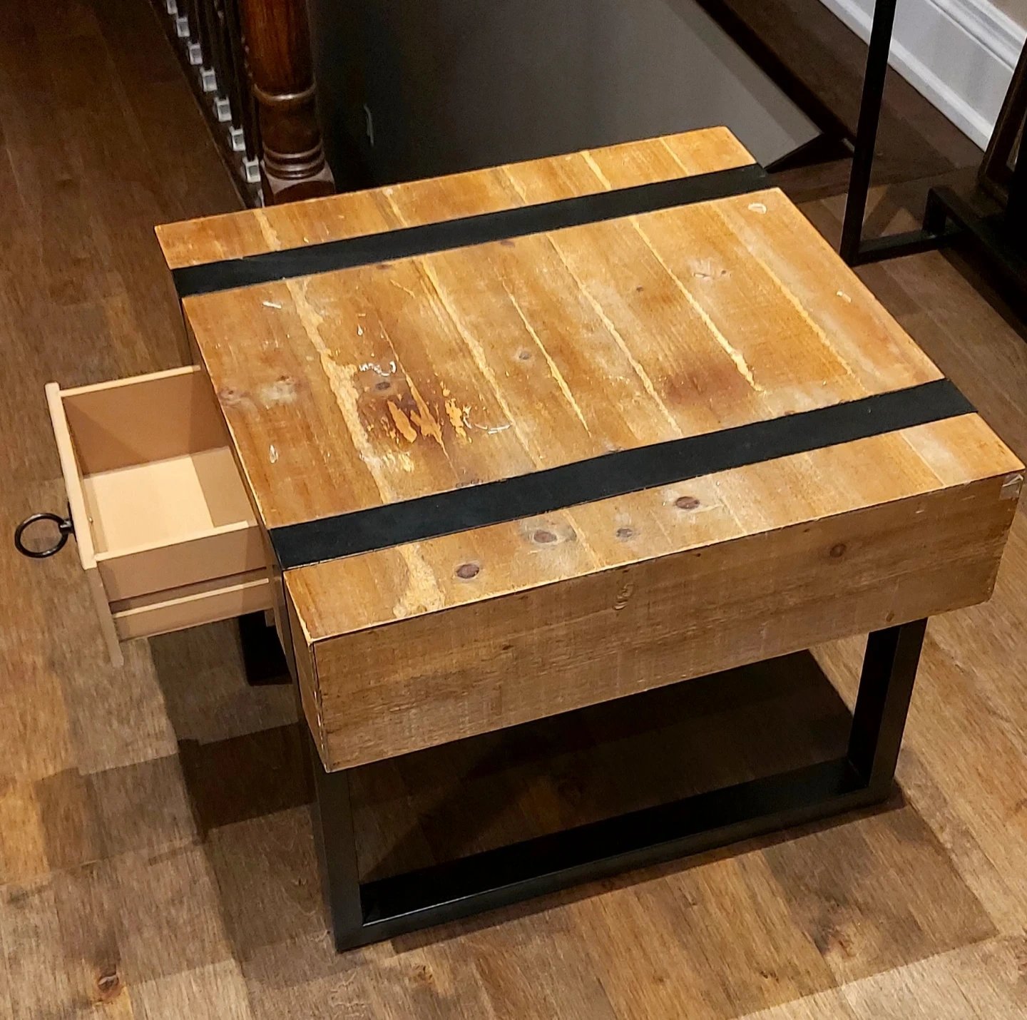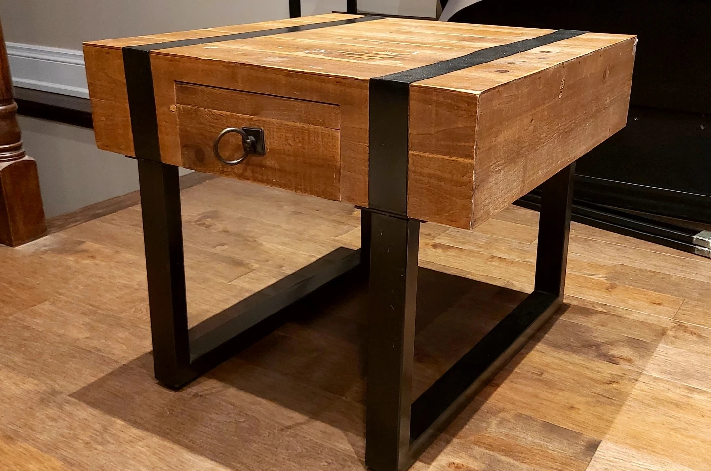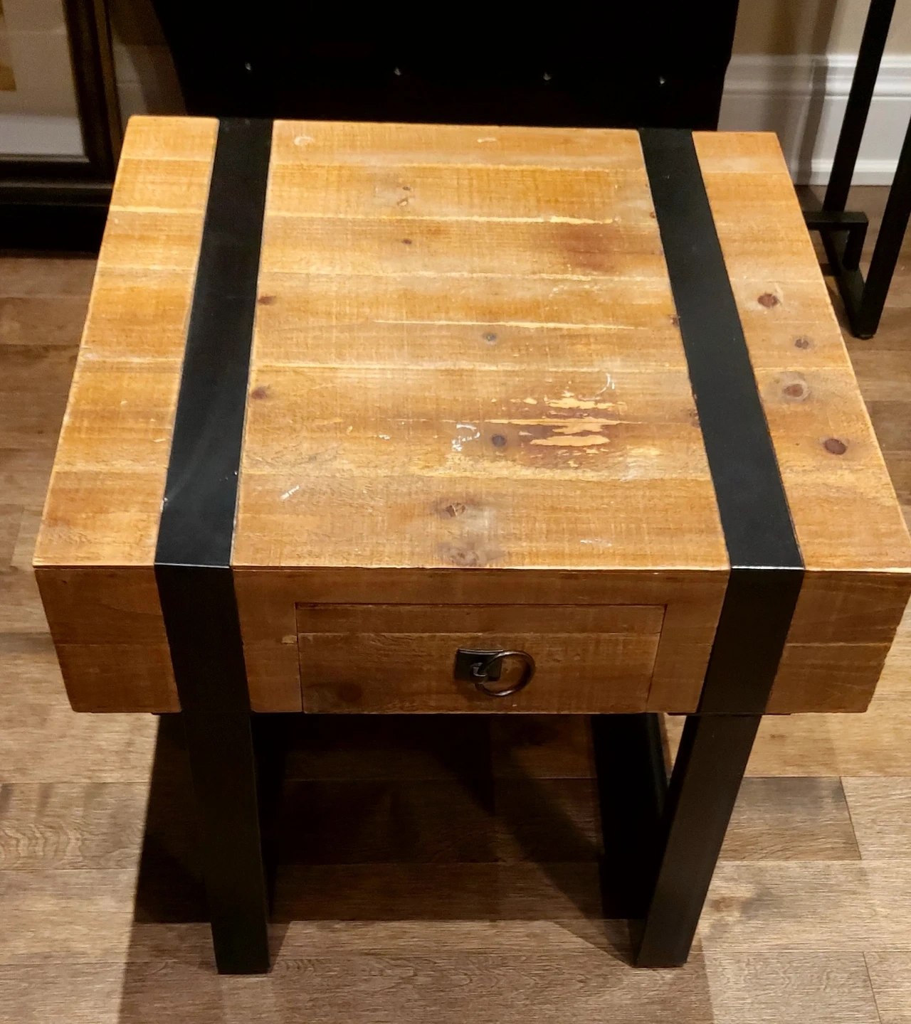 Selling a stylish side table with a wooden top and a black metal frame. It features a handy drawer with a ring pull. Perfect for adding a rustic touch to your living room or bedroom!