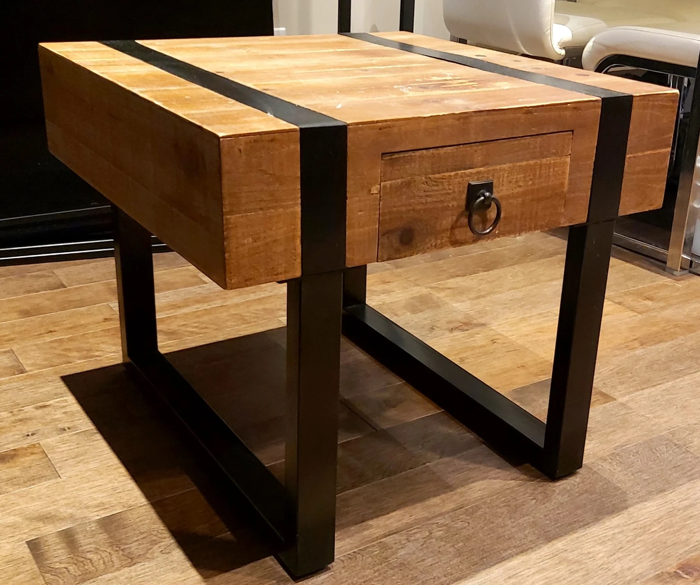 Selling a stylish side table with a wooden top and a black metal frame. It features a handy drawer with a ring pull. Perfect for adding a rustic touch to your living room or bedroom!