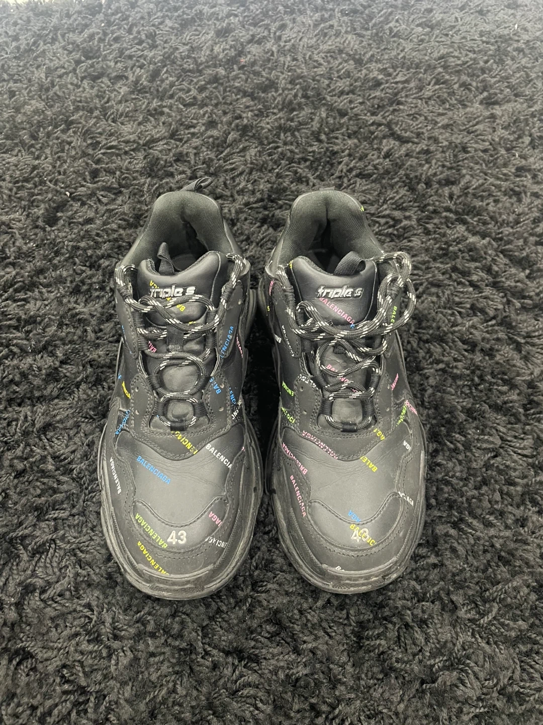 Selling a pair of Balenciaga Triple S sneakers in size 43. They are black and have the Balenciaga name printed all over in different colours. They're in good condition, ready for a new owner!