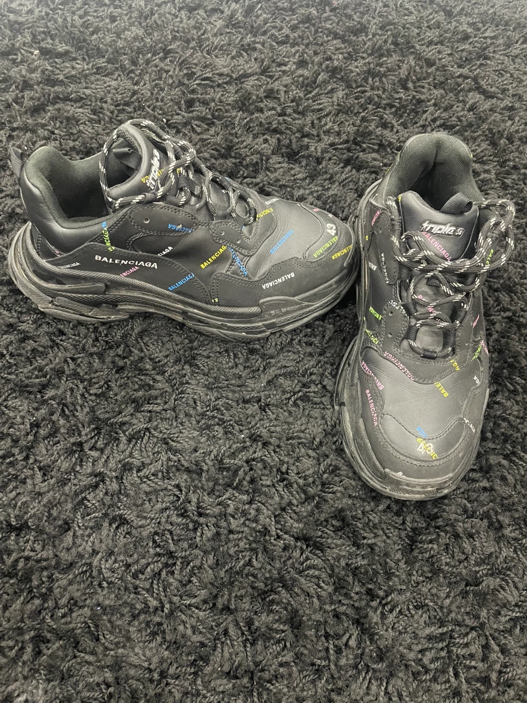 Selling a pair of Balenciaga Triple S sneakers in size 43. They are black and have the Balenciaga name printed all over in different colours. They're in good condition, ready for a new owner!