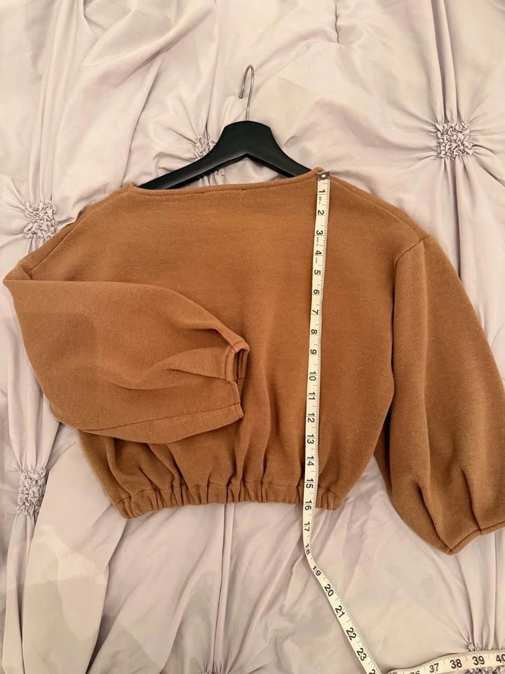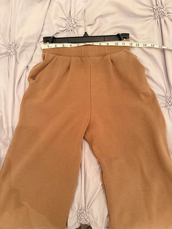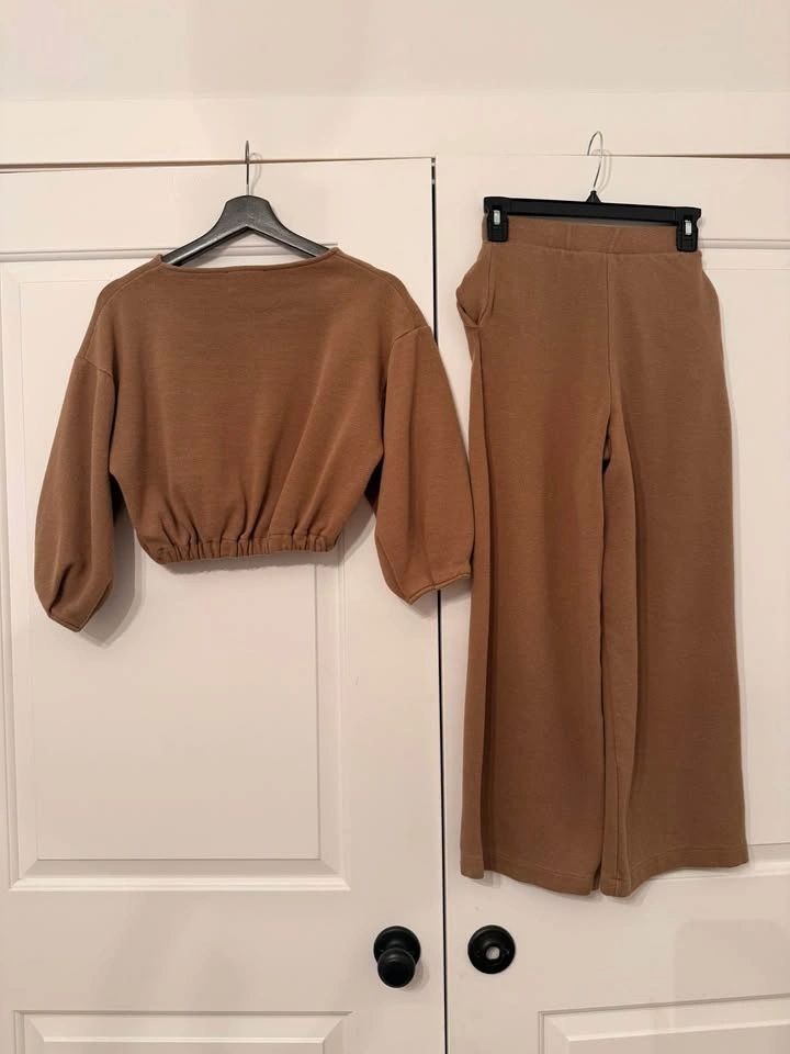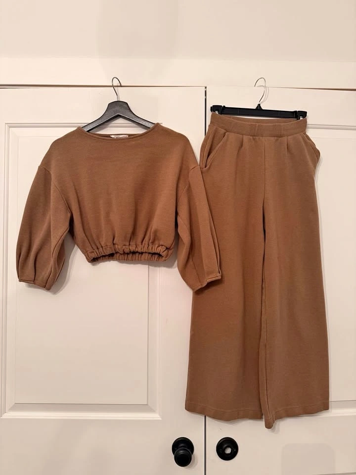 Mango (MNG) matching camel lounge set in like-new condition (5/5). Cropped long-sleeve top with an elastic hem for a flattering fit + comfy matching pants—perfect for cozy days, travel, or casual outings.
