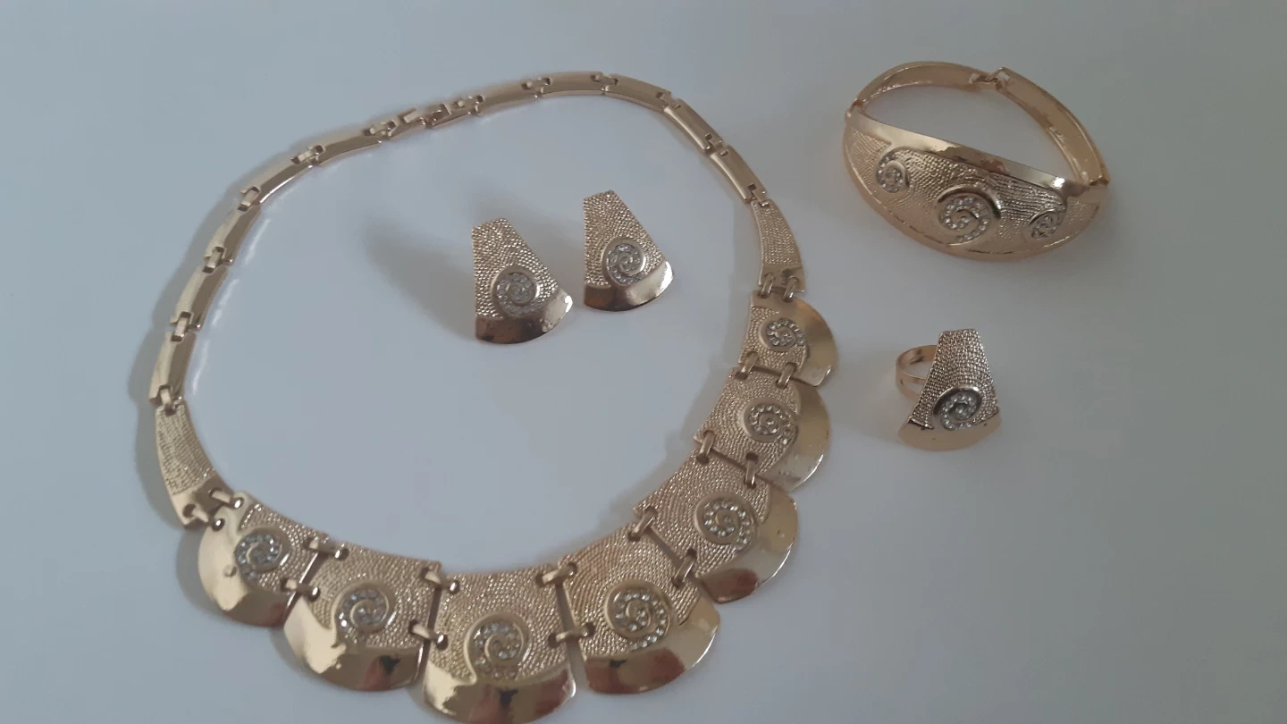 Selling a lovely gold tone jewellery set! Includes a necklace, ring, earrings, and bracelet. Perfect for adding a touch of elegance to any outfit