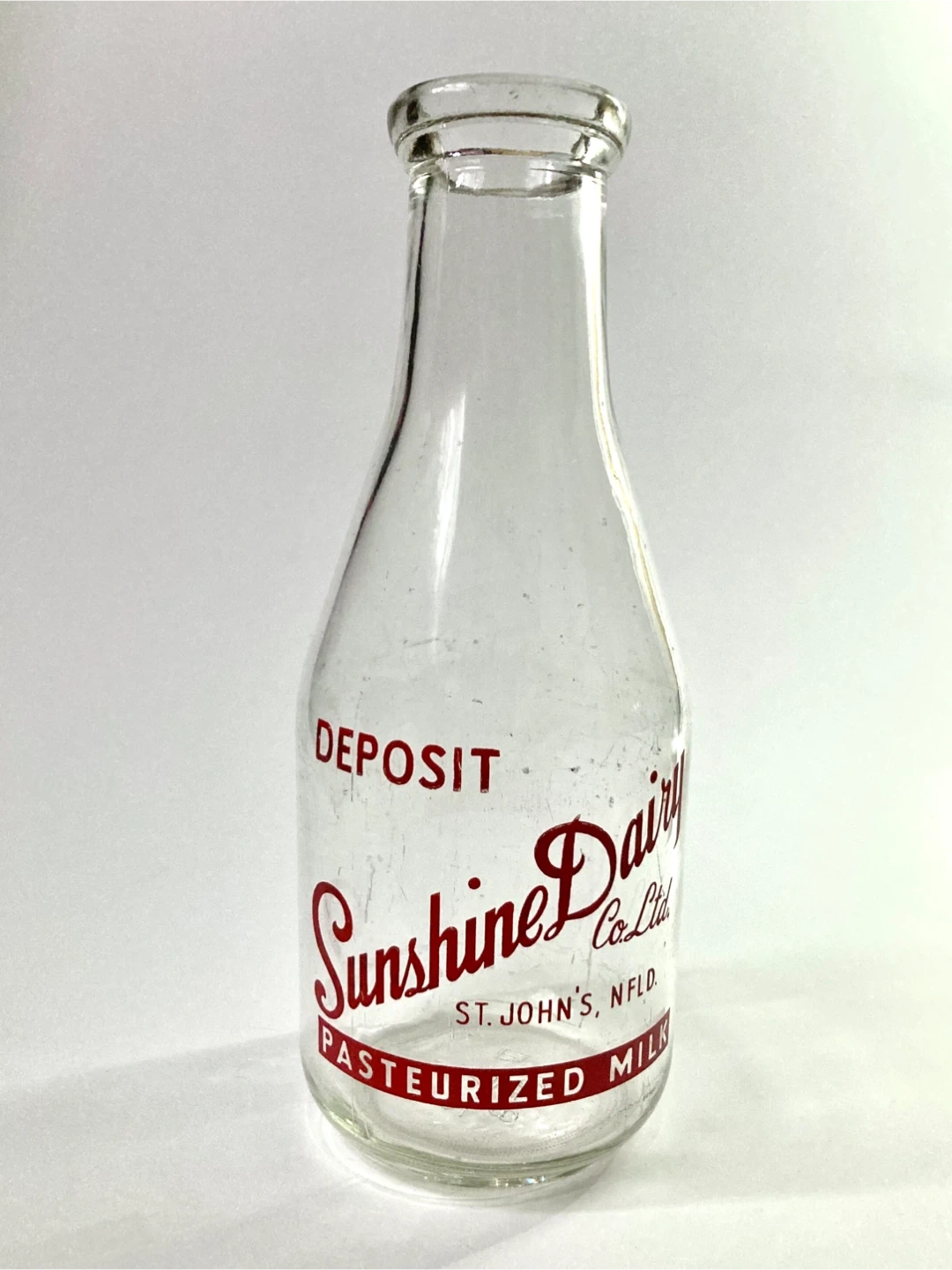 Very rare antique glass milk bottle from the Sunshine Dairy Co. Ltd., which was located in St. John's, Newfoundland. Could date back to the 1920s. There are definitely signs of use, but in very good condition considering its age. No chips or cracks. About 10” tall.