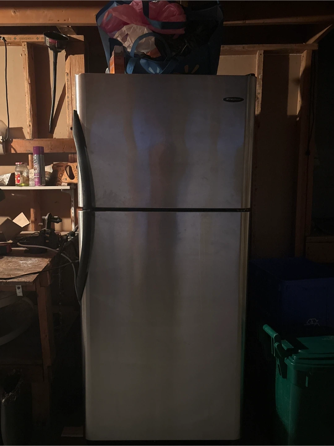 Selling a frigidaire refrigerator in silver colour. It's a great appliance for any home. It has a top freezer and a bottom refrigerator section. It's in good condition and ready to be used!