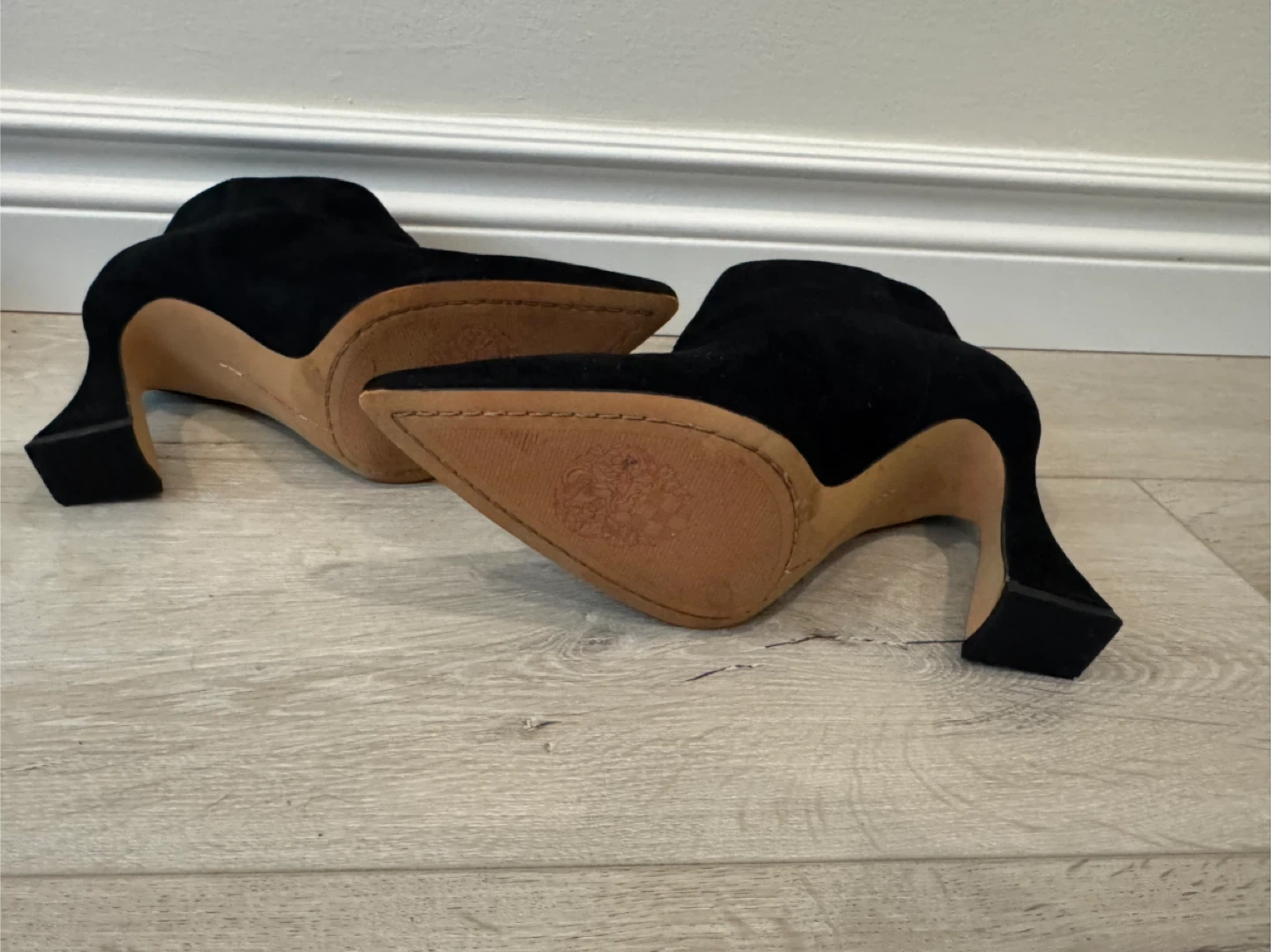 Selling a pair of Vince Camuto black suede booties in size 6. They are in great condition and have a unique heel design that adds a touch of style to any outfit