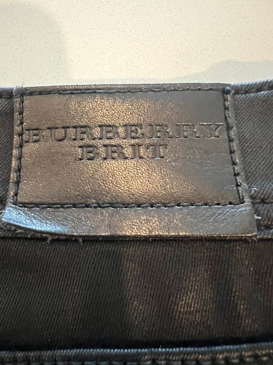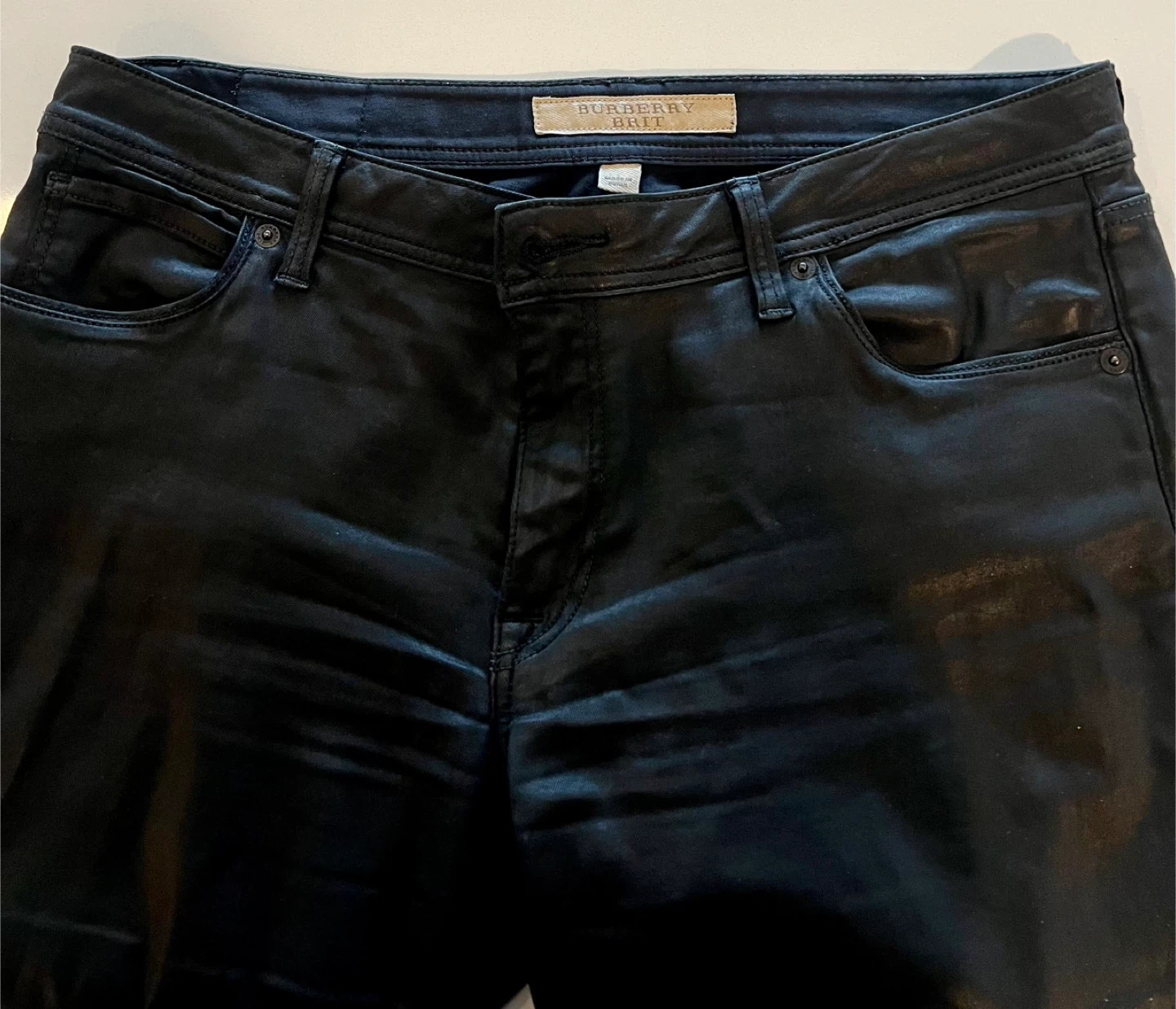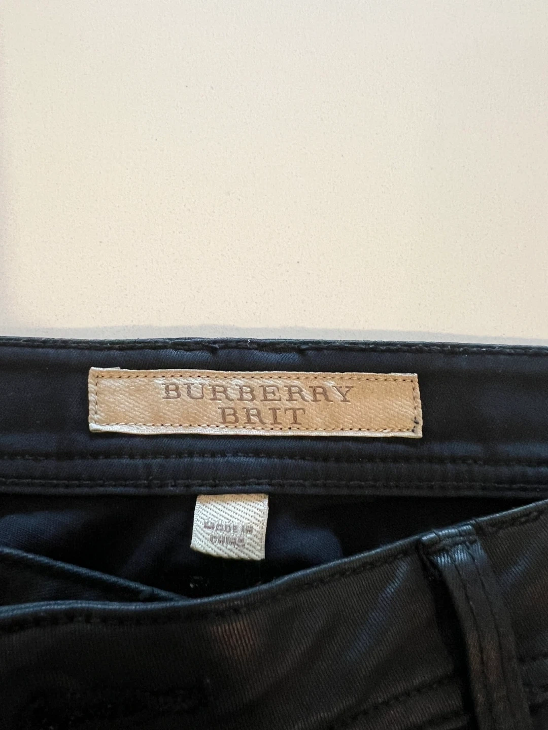Selling a pair of Burberry Brit black skinny low-rise jeans. They are a size W31. The outer material is 89% cotton, 7% polyester, and 4% elastane, with a leather trim of 100% cow grain leather.