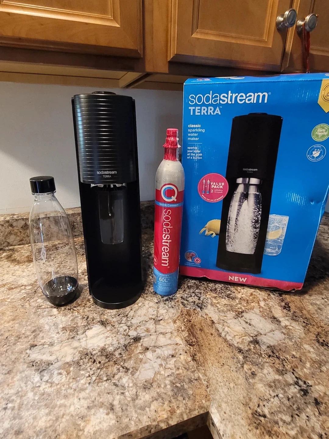 I'm selling a brand new SodaStream Terra sparkling water maker! It's still in the box and ready to use. This classic sparkling water maker lets you sparkle your water at the push of a button. Also included is a SodaStream 60L CO2 cylinder and a reusable SodaStream bottle. This is a great Earth Friendly way to make sparkling water at home!