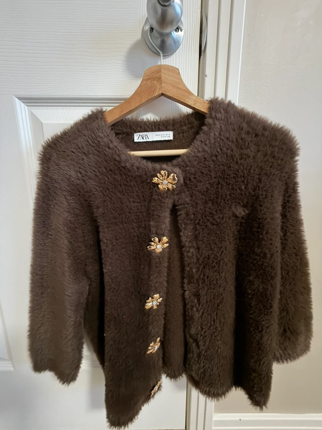 Selling a Zara brown fuzzy cardigan in size medium. It has a soft, textured feel and features decorative gold flower buttons. Perfect for adding a touch of cozy style to any outfit!