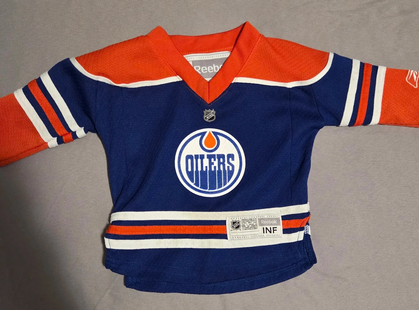 Selling a toddler-sized Edmonton Oilers jersey by Reebok. It's in good condition and features the classic Oilers colours and logo. Perfect for your little hockey fan!