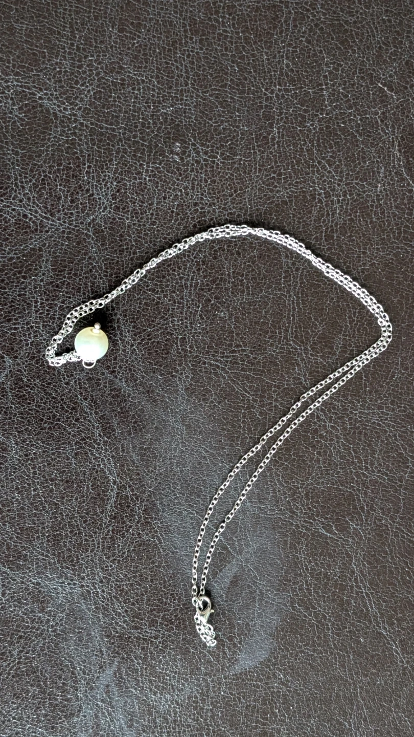 A simple and elegant pearl pendant necklace. The chain is a delicate silver colour, and the pearl is a classic off white colour. It's in brand new condition and ready to wear.