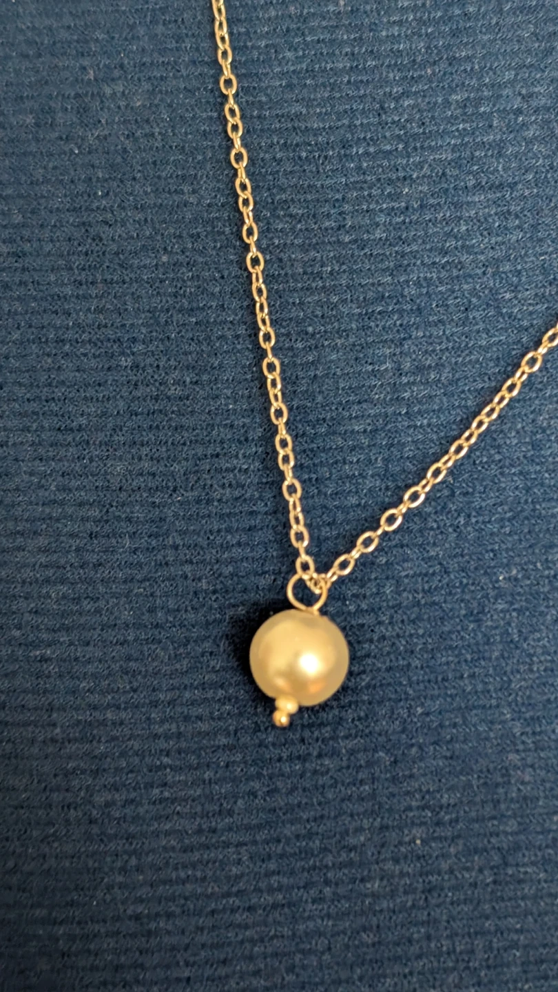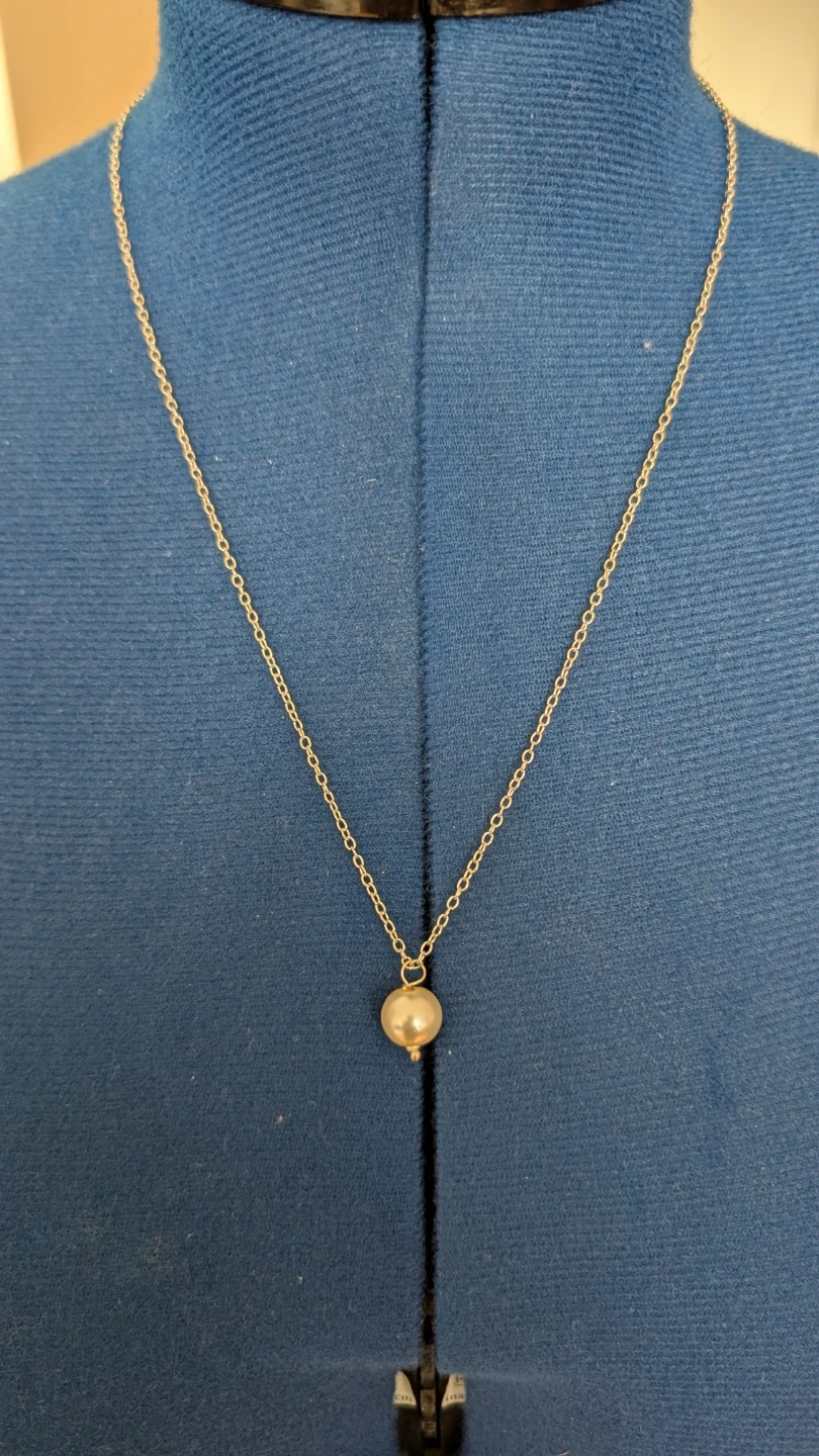 A simple and elegant pearl pendant necklace. The chain is a delicate silver colour, and the pearl is a classic off white colour. It's in brand new condition and ready to wear.