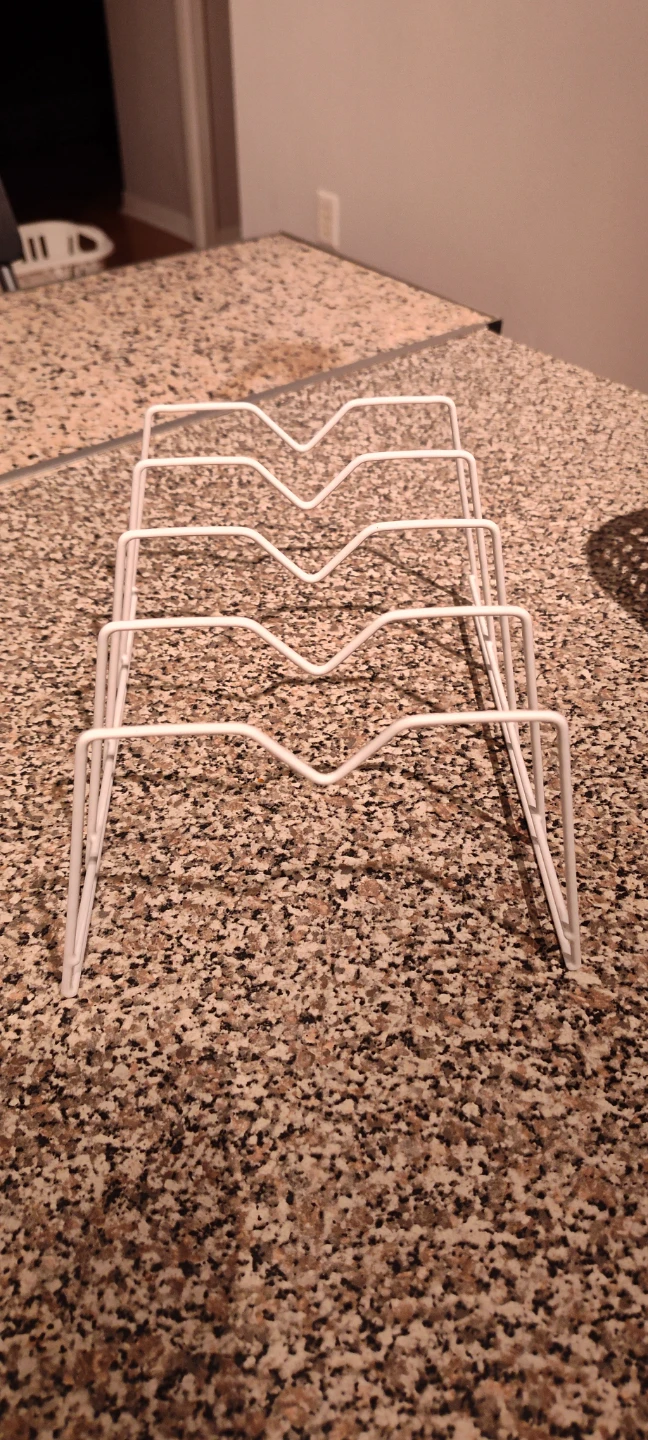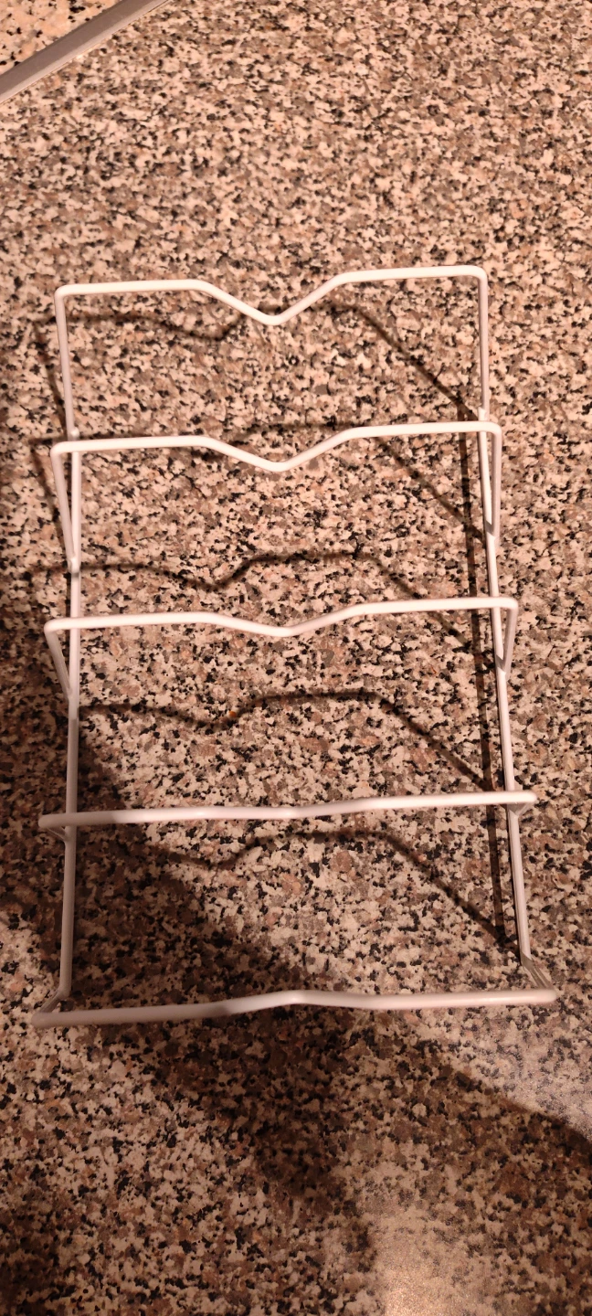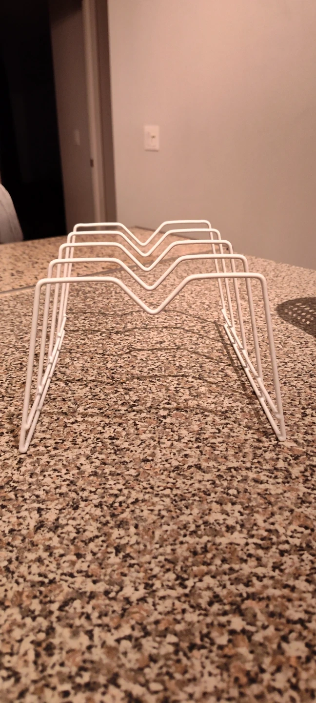 Here's a handy white metal organizer for your pot lids or plates! It's in great shape and ready to help keep your kitchen cabinets tidy