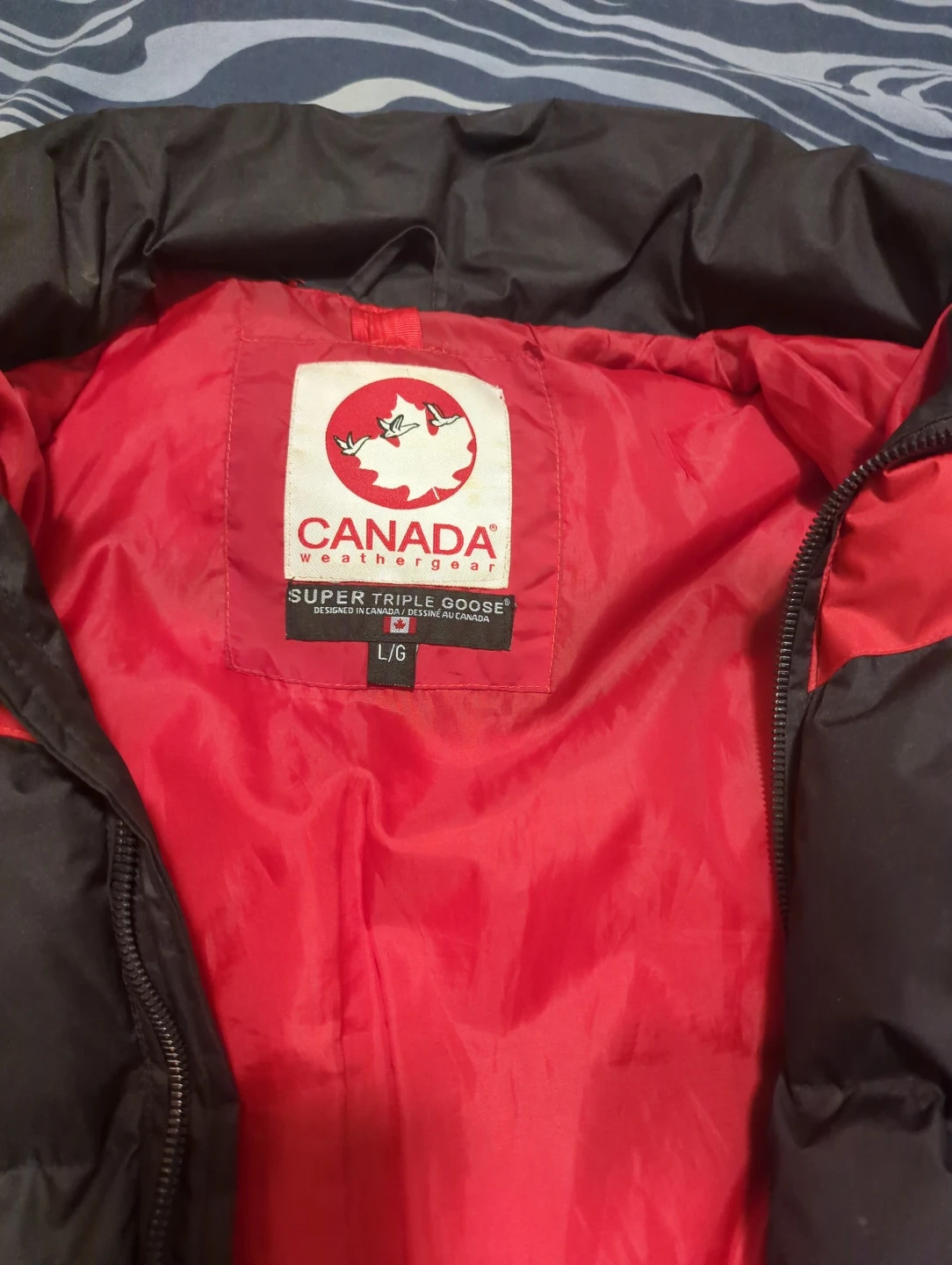 Selling a Canada Weathergear Super Triple Goose puffer jacket. It's a size L/G and features a black, red, and white colour scheme. Perfect for staying warm during the colder months!