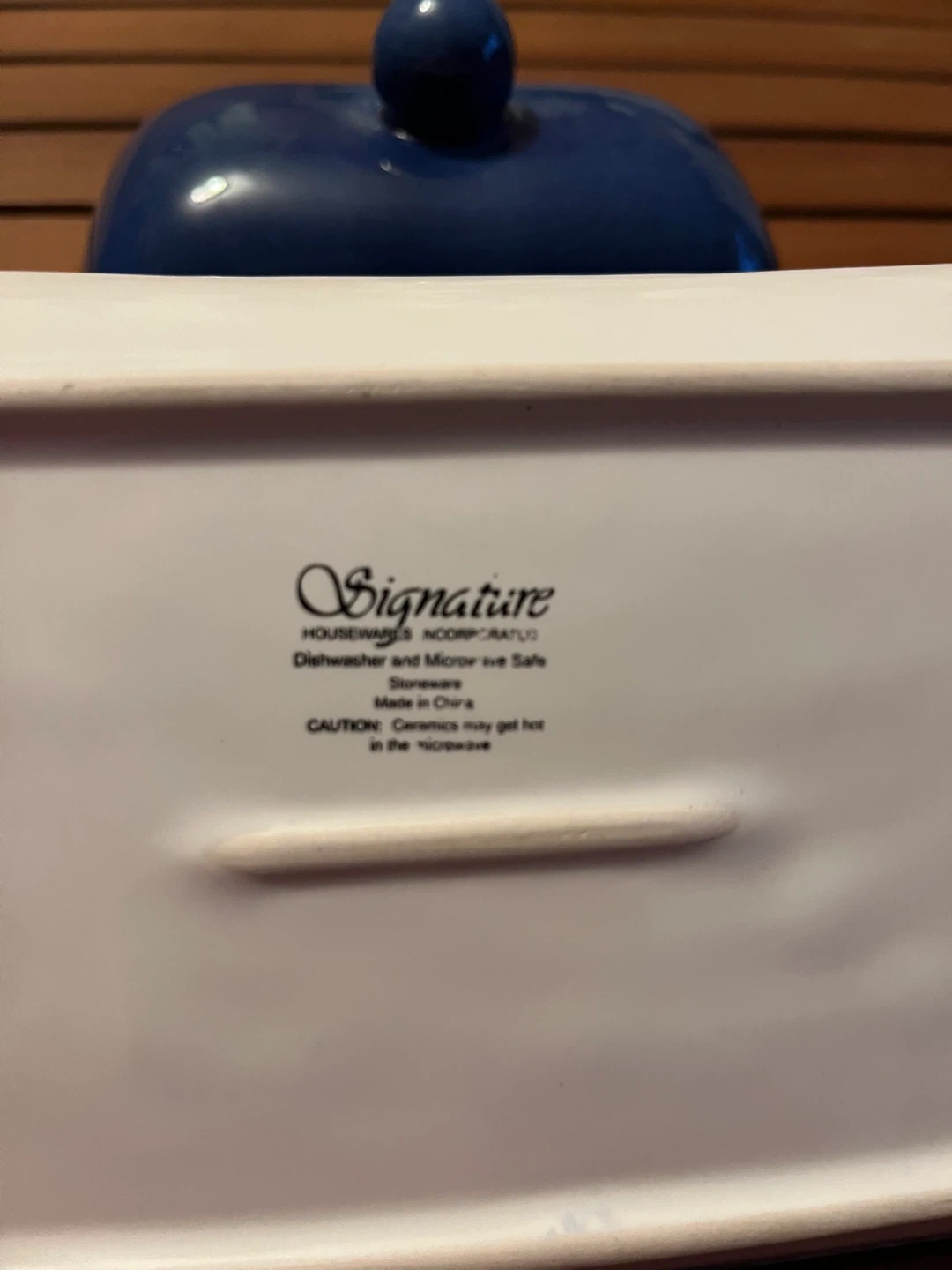 This is a Signature Housewares butter dish in a lovely shade of blue! It's in great condition and ready to add a touch of elegance to your table. It's dishwasher and microwave safe.