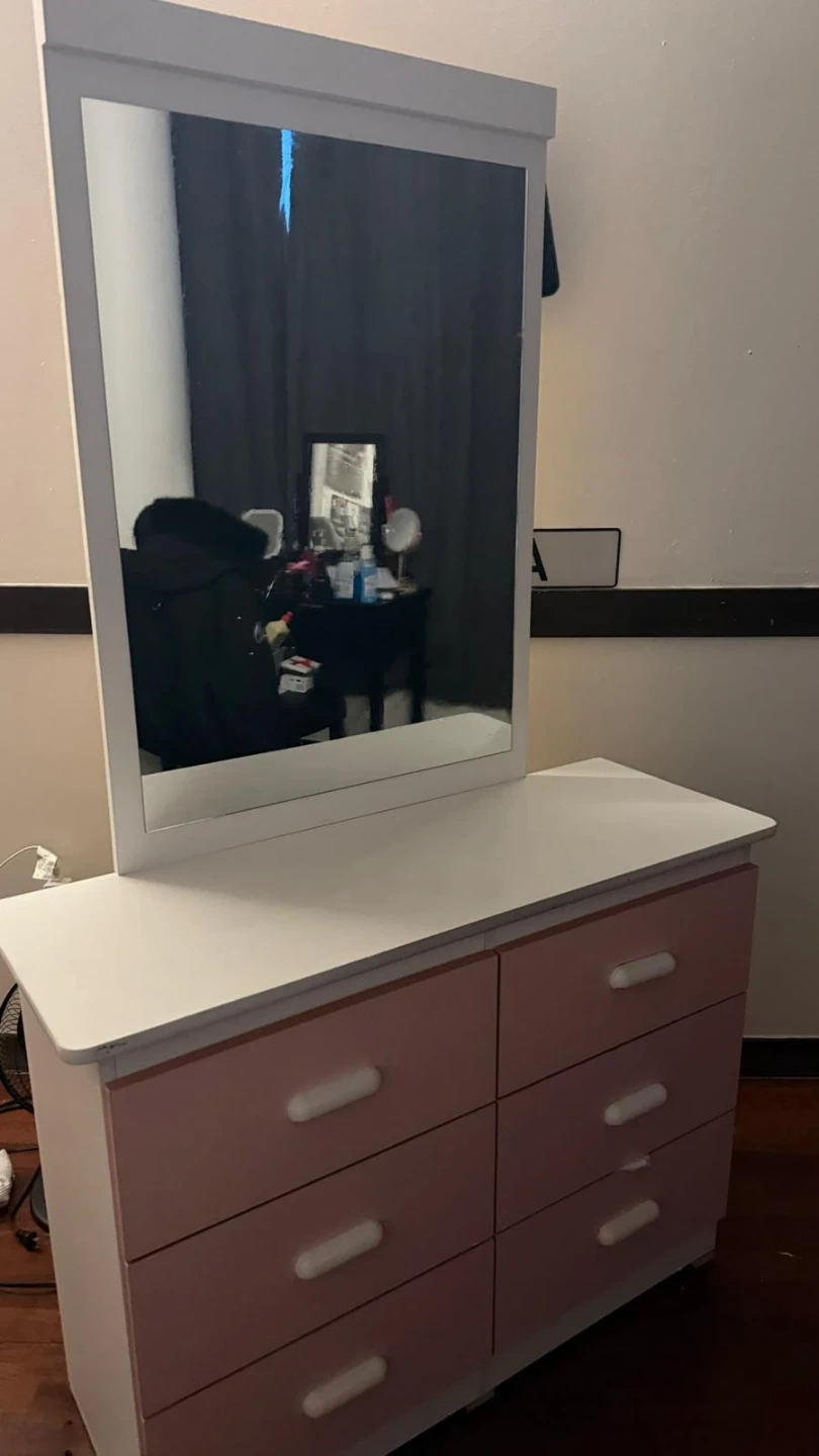 Selling a dresser with a mirror and a bed frame. The dresser is white with pink drawers. The bed frame is white. Great for a bedroom set! Including mattress