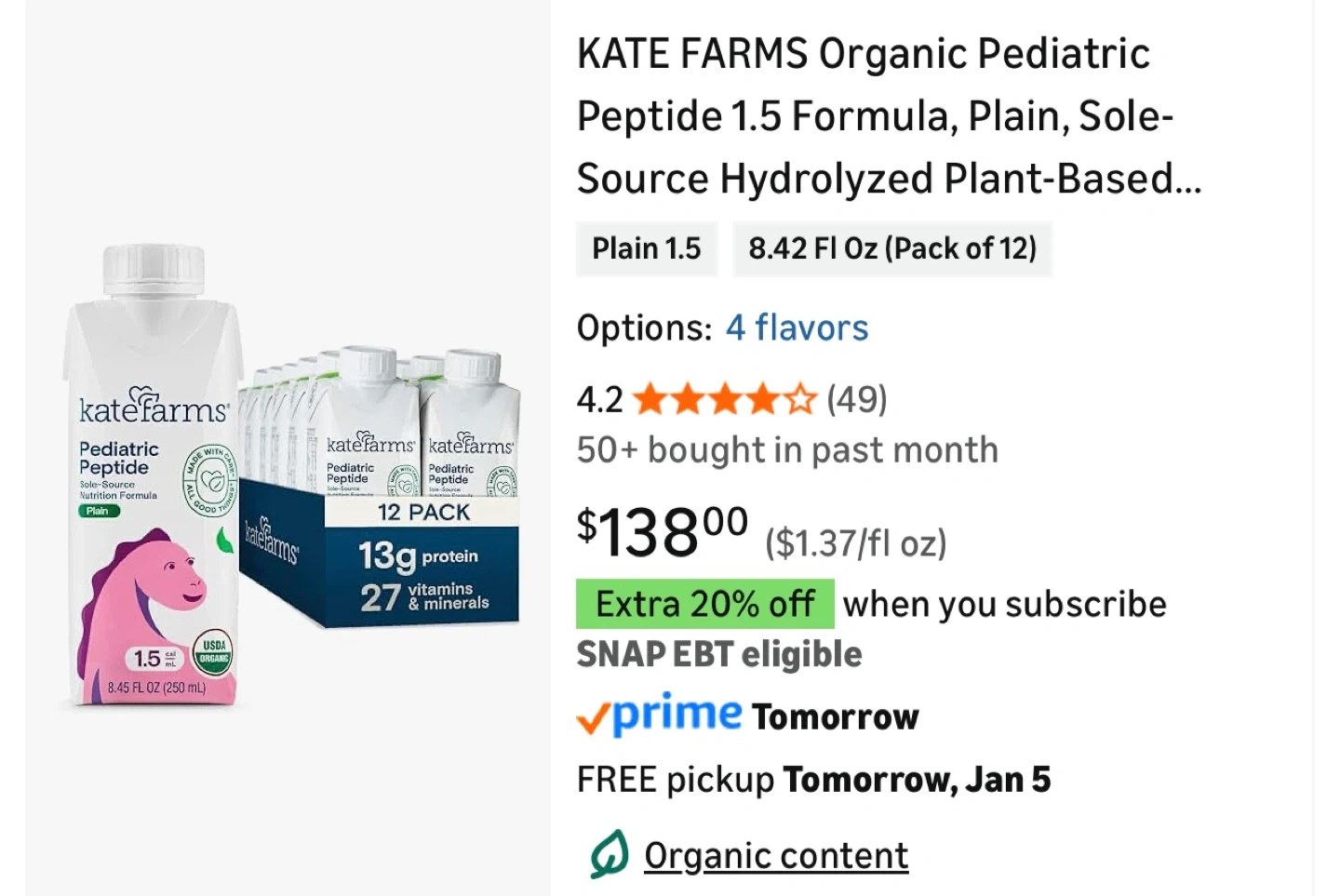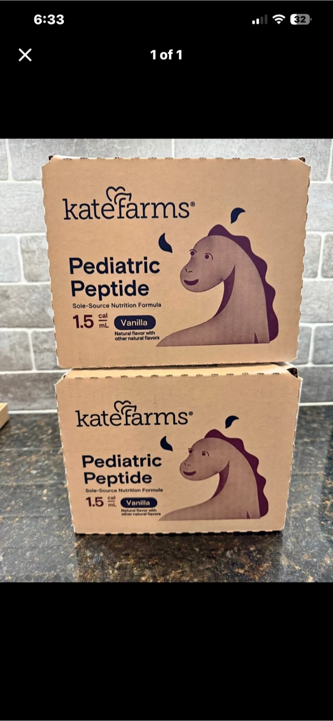 Selling Kate Farms Organic Pediatric Peptide 1.5 Formula, plain flavor. It's a sole-source hydrolyzed plant-based nutrition formula. Each container is 8.45 fl oz (250 mL). It contains 13g of protein and 27 vitamins & minerals. The box is included!