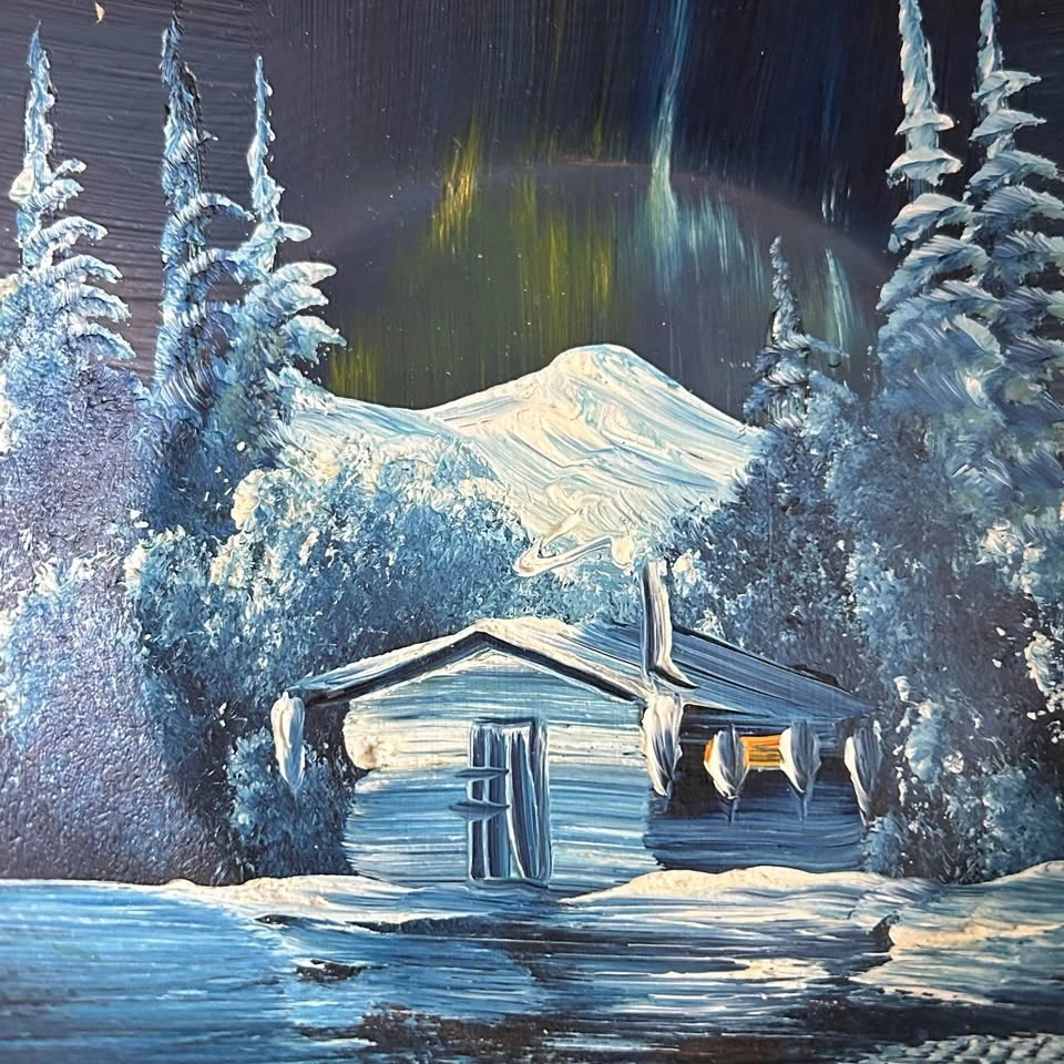 The artwork is hand-painted (not a print) and signed by the artist on the front. The shallow metal pan form adds character and makes it an eye-catching wall décor piece. A great fit for rustic, cabin, lodge, or winter-themed interiors, as well as for collectors of folk and decorative art.