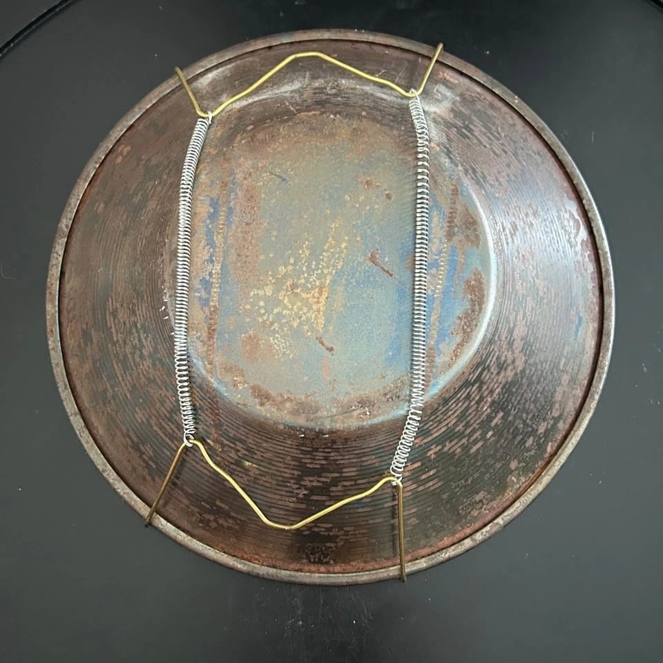 Shows age-appropriate wear and patina consistent with a vintage painted metal piece, enhancing its authenticity and charm. Hanging hardware is already installed on the back.