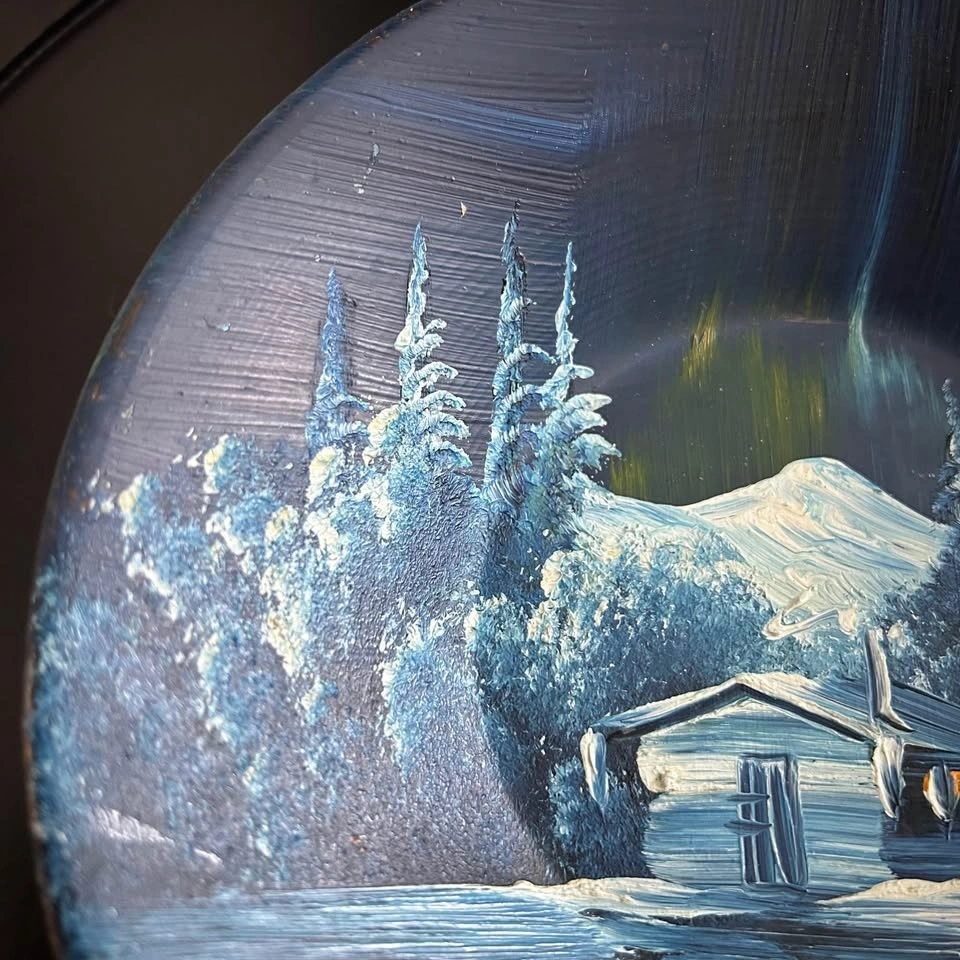 Vintage hand-painted metal pan featuring a tranquil snowy mountain and forest water scene. Painted directly on metal with expressive brushwork and rich blue winter tones, creating depth, movement, and a calm northern atmosphere.