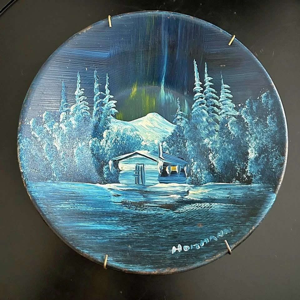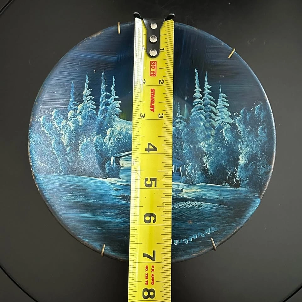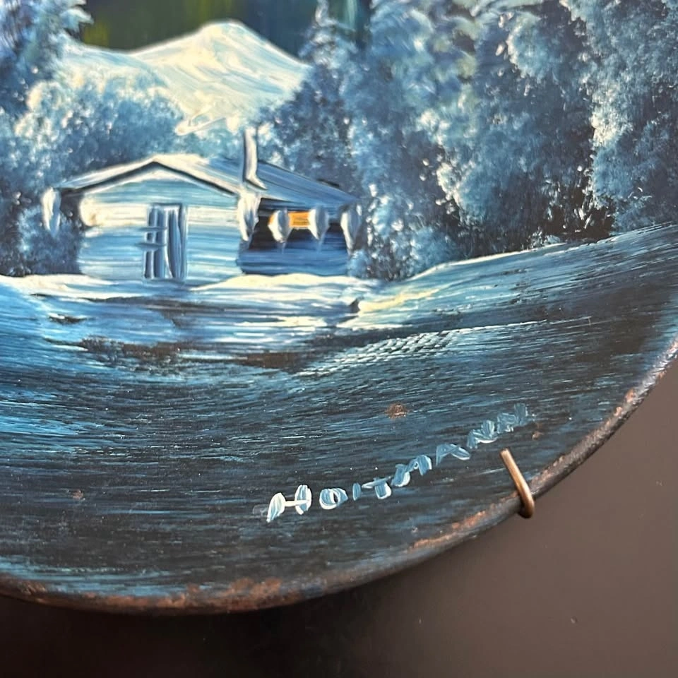 The artwork is hand-painted (not a print) and signed by the artist on the front. The shallow metal pan form adds character and makes it an eye-catching wall décor piece. A great fit for rustic, cabin, lodge, or winter-themed interiors, as well as for collectors of folk and decorative art.