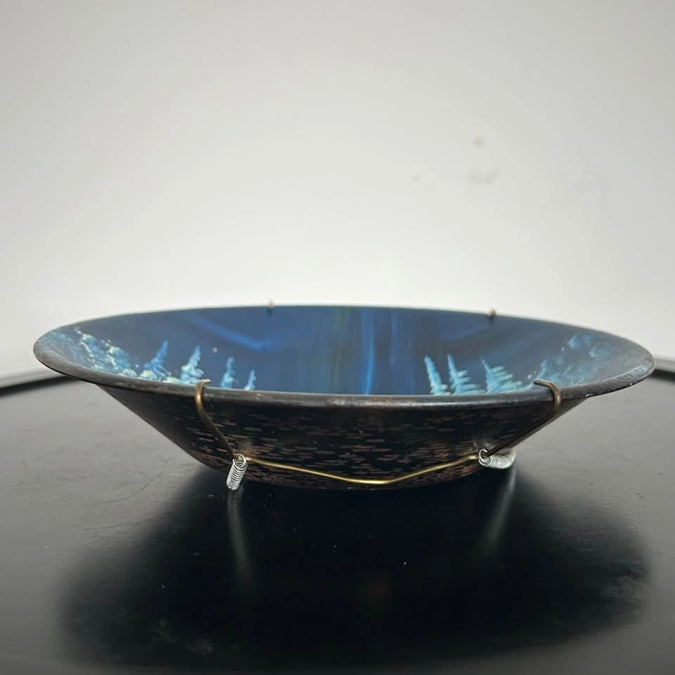 Vintage hand-painted metal pan featuring a tranquil snowy mountain and forest water scene. Painted directly on metal with expressive brushwork and rich blue winter tones, creating depth, movement, and a calm northern atmosphere.
