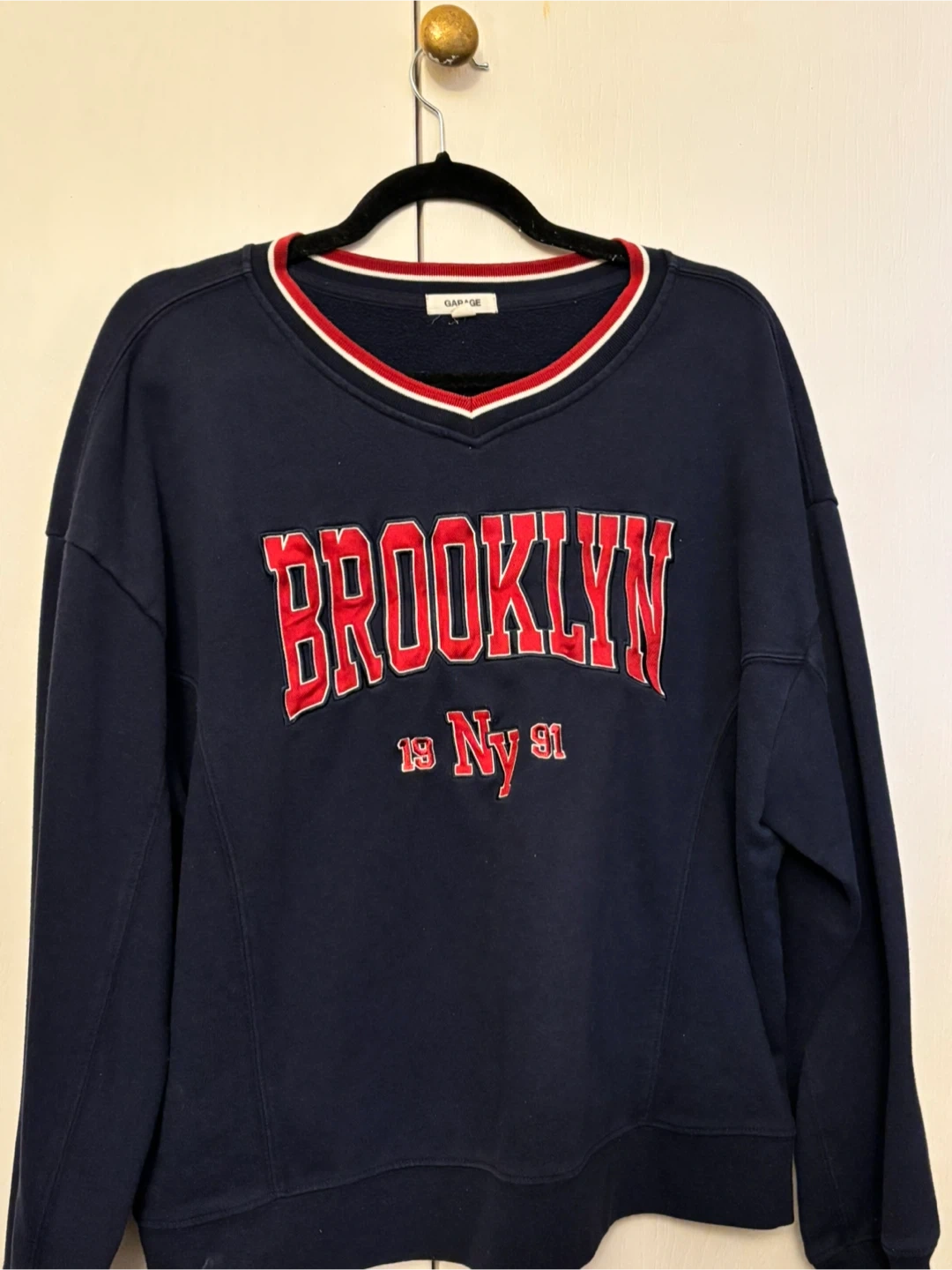 Cozy up in this navy blue sweatshirt from Garage! It features a red and white trimmed V-neck and 'Brooklyn 19 Ny 91' embroidered on the front. Perfect for a casual day out or lounging at home