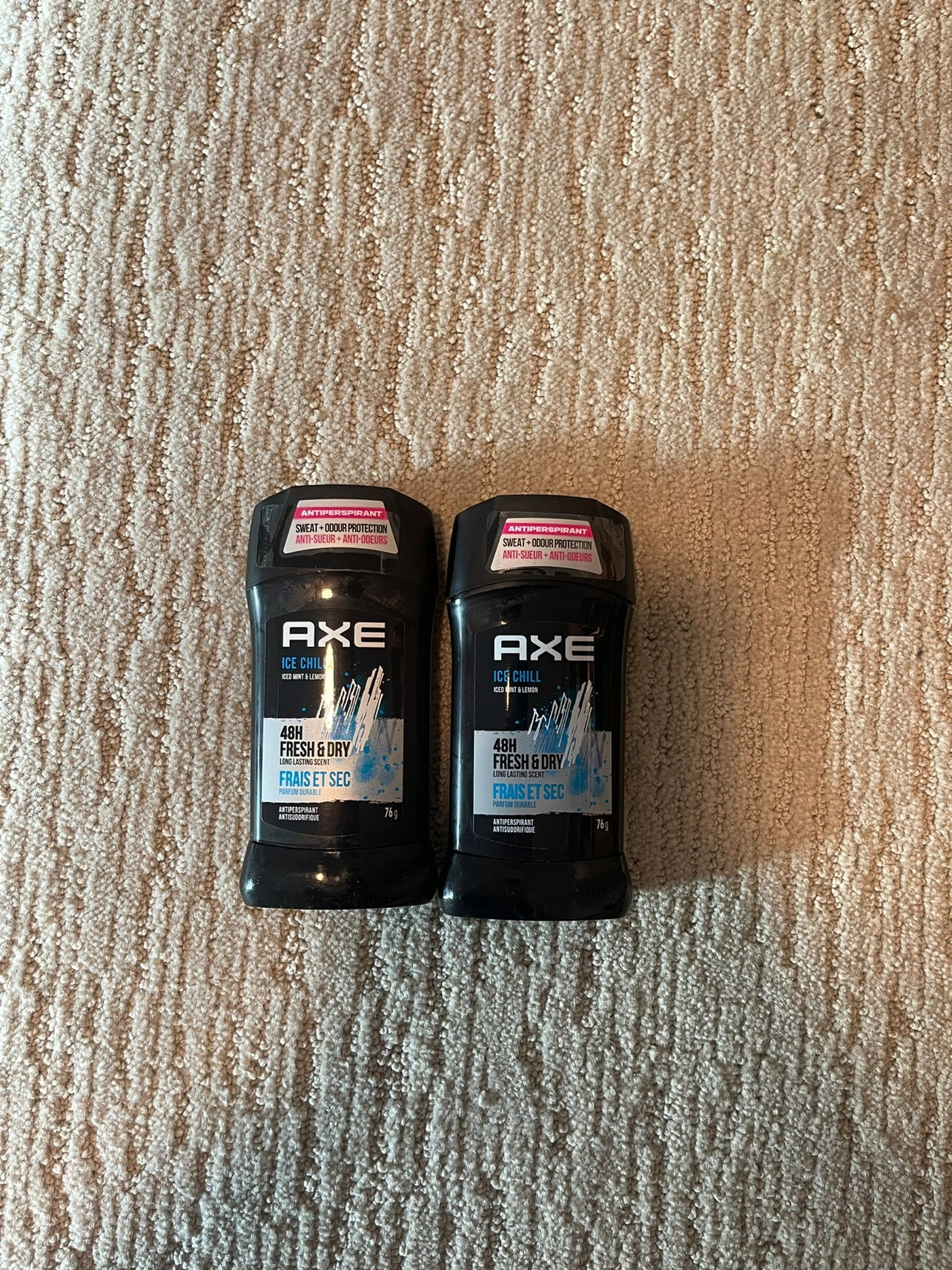 Selling two Axe Ice Chill antiperspirant sticks. They provide 48-hour sweat and odour protection, keeping you fresh and dry. Perfect for everyday use!