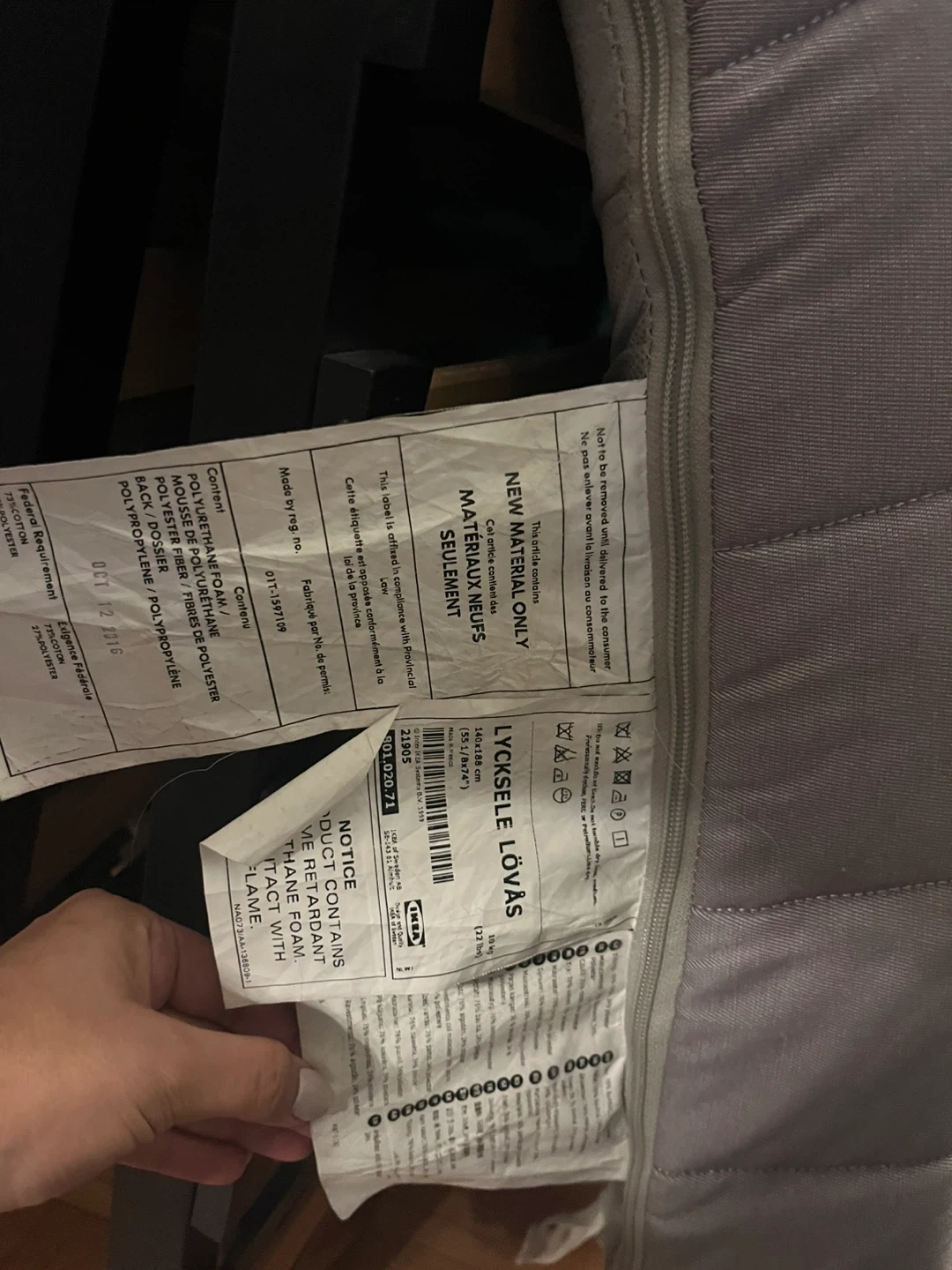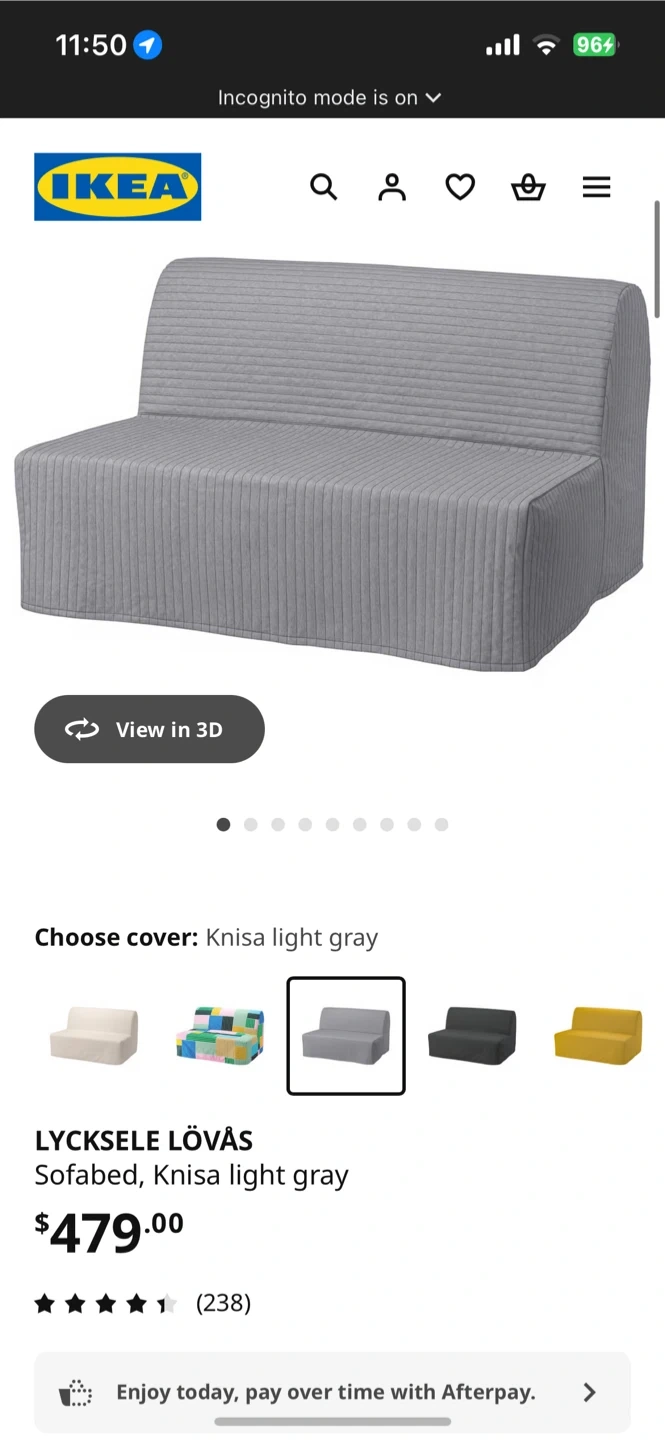 Selling an IKEA LYCKSELE LÖVÅS sofa bed in Knisa light gray! The dimensions are 142 cm (55 7/8") wide, 87 cm (34 1/4") high, and 100 cm (39 3/8") deep. When folded out, it's 188 cm (74") long. The cover is made of 99% polyester. Originally bought for $479.00.