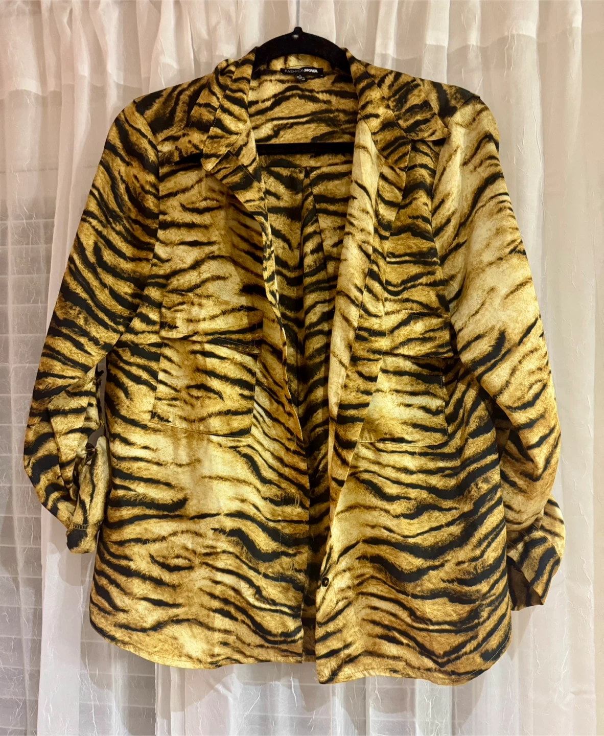 Selling a Fashion Nova office shirt with a bold tiger print. It's in great condition and perfect for making a statement. The material feels nice and light!