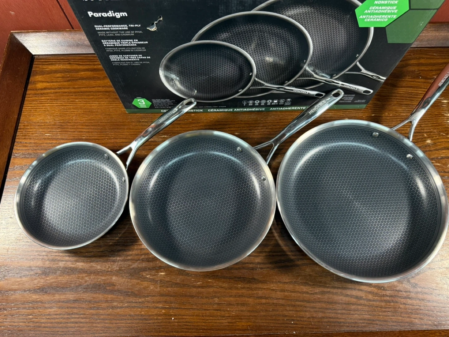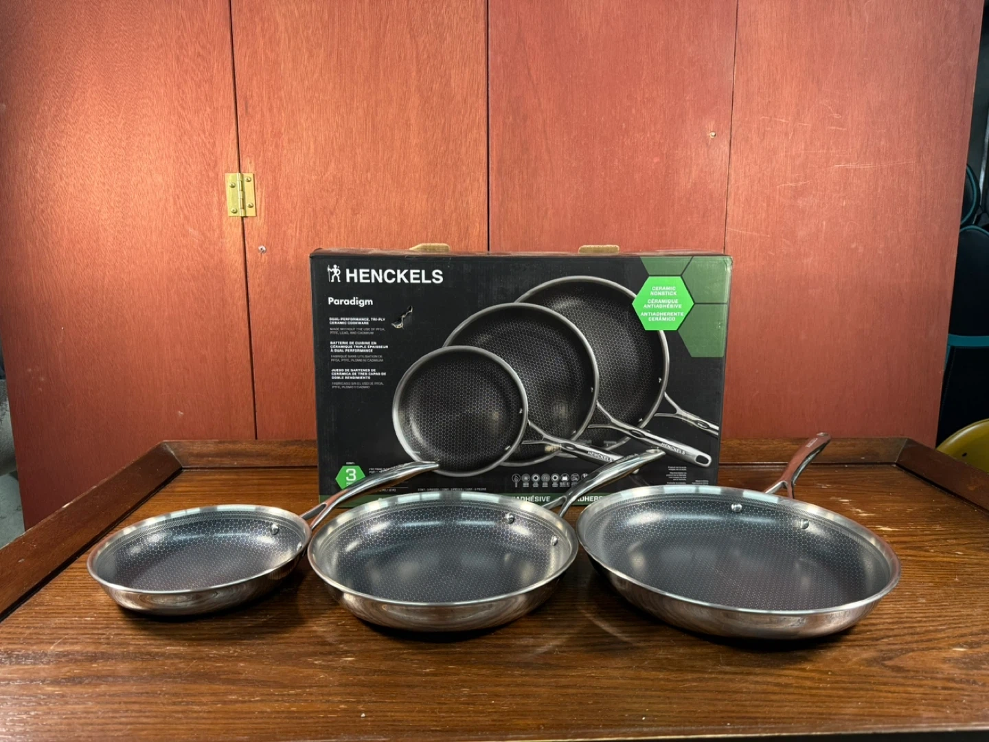 This Henckels Paradigm fry pan set includes three nonstick frying pans designed for versatile cooking on all stovetops. These pans feature a durable stainless steel construction and a ceramic nonstick coating, perfect for healthy cooking and easy cleanup.