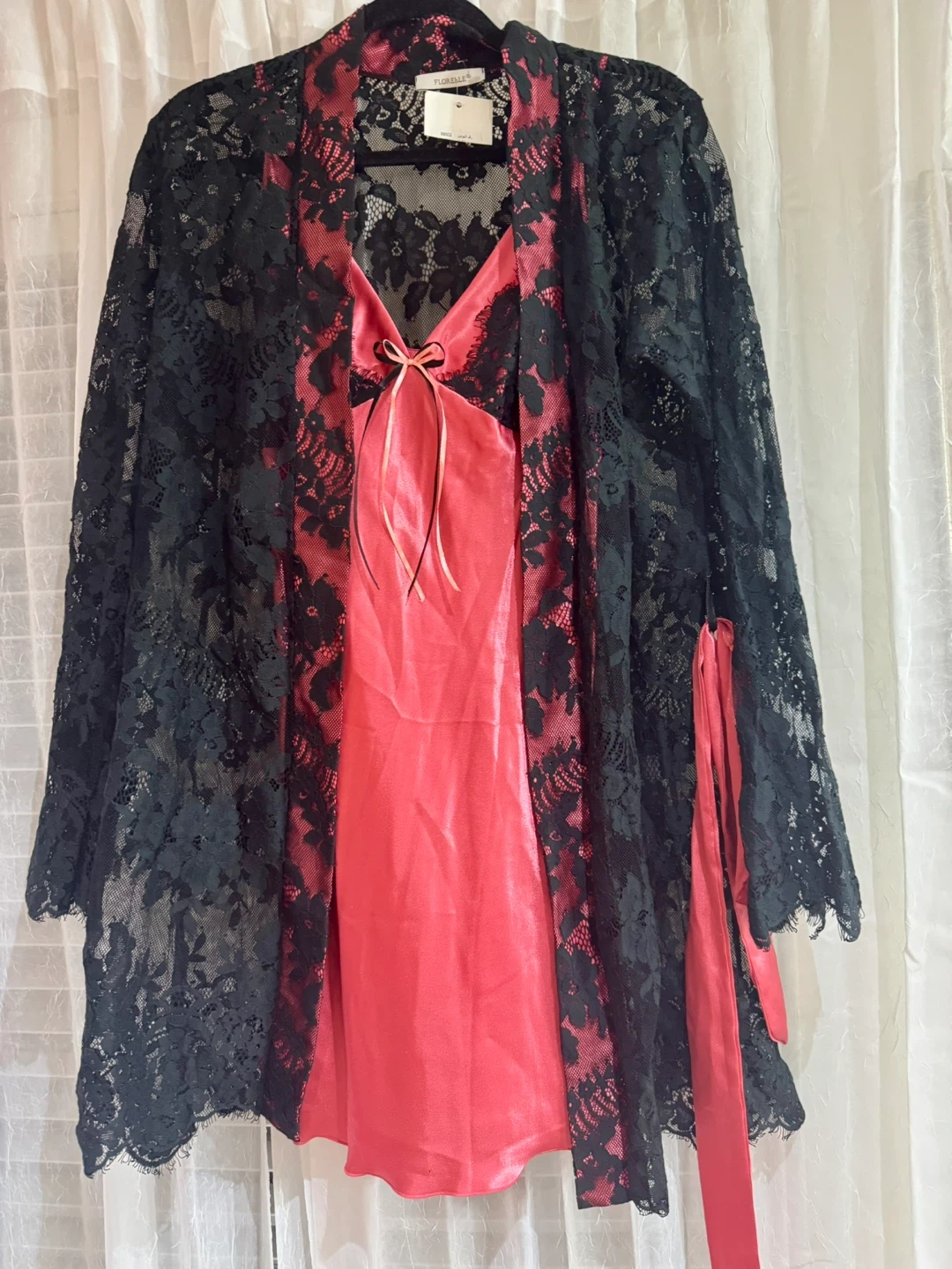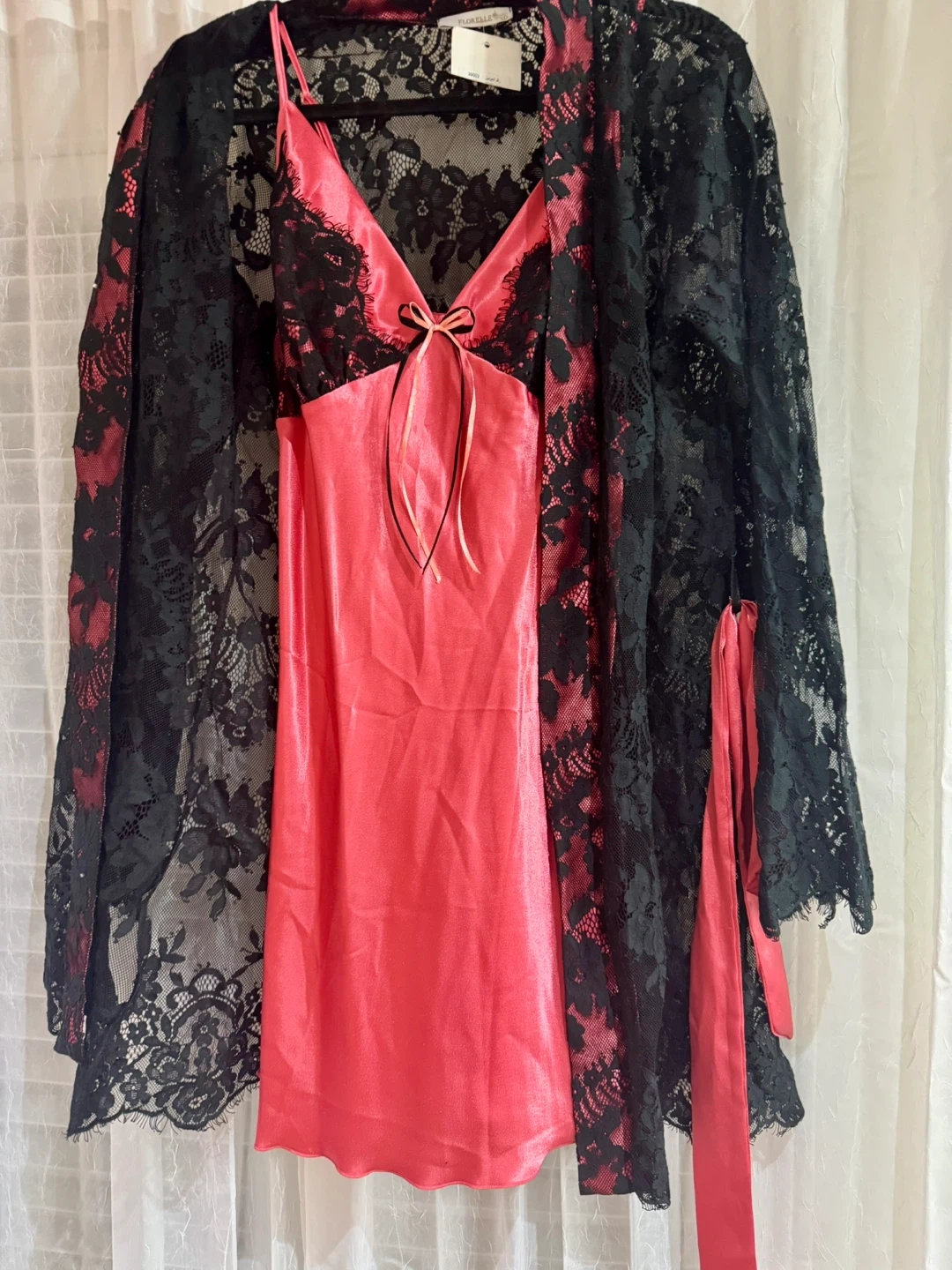 Selling a lovely lace robe and slip set. It features a beautiful combination of pink and black lace detailing. Perfect for lounging or adding a touch of elegance to your evening routine!