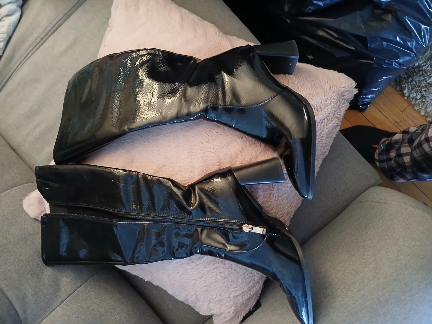 These are a pair of stylish black patent leather heeled boots. They feature a zipper closure and a block heel. Perfect for adding a touch of shine to your outfit!