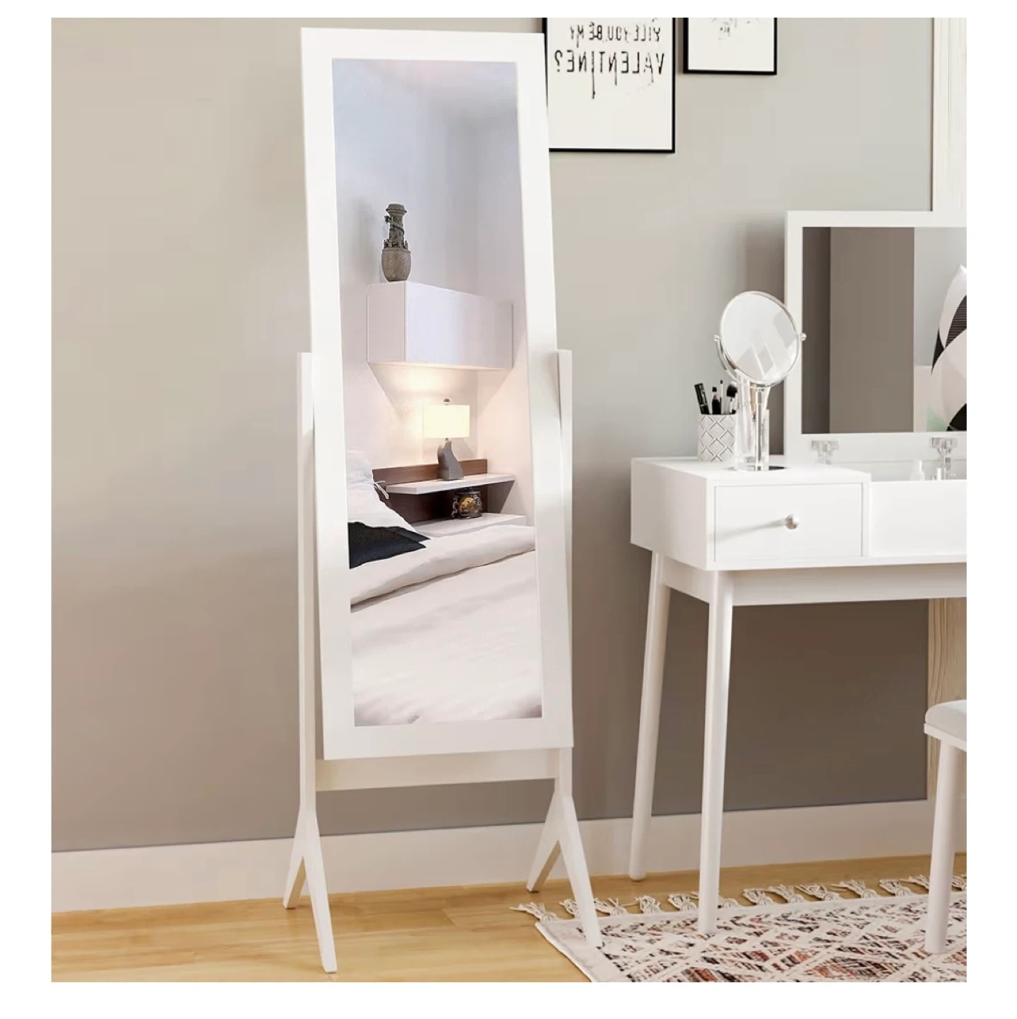 Here's a lovely standing mirror perfect for any room! It's a full-length mirror with a clean white frame.