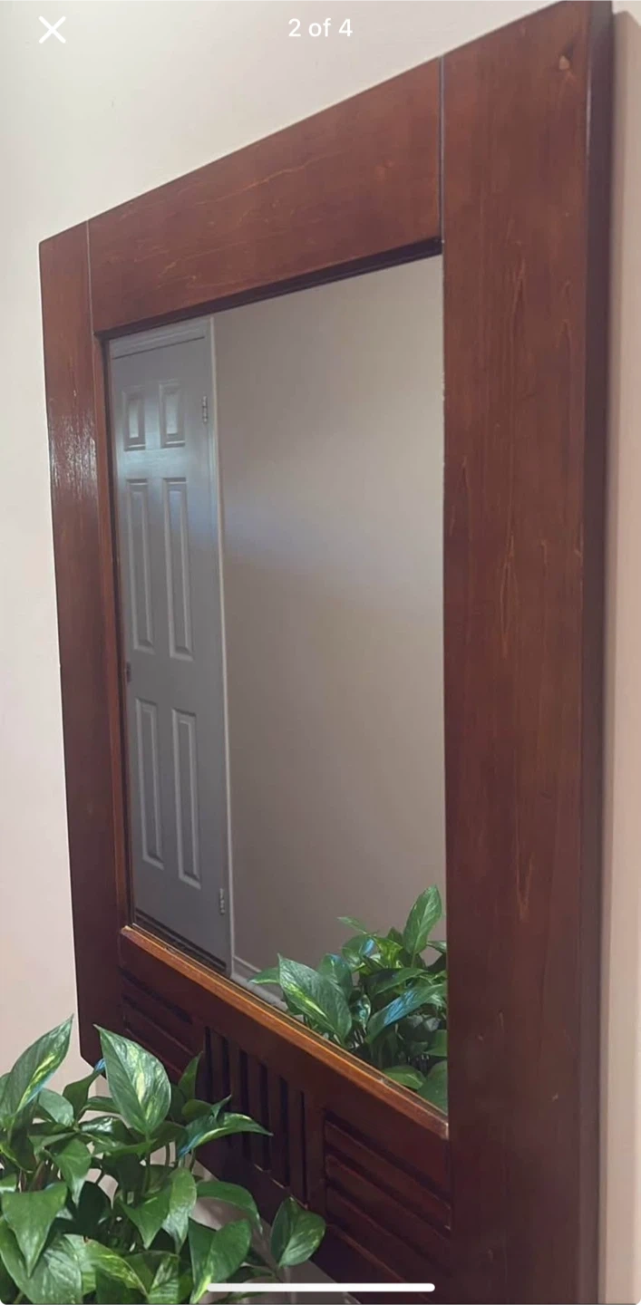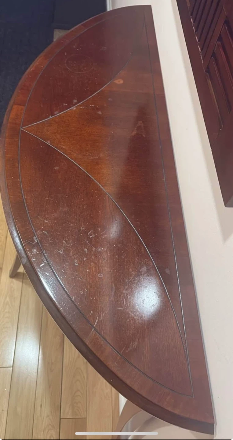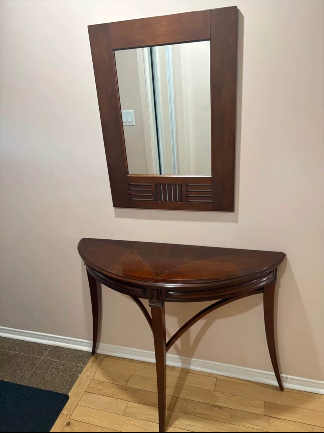 Selling a lovely wood hallway table with a matching mirror. It's in good condition and would look great in any entryway. The table has a unique half-moon shape and the mirror has a rectangular frame. Perfect for adding a touch of elegance to your home!