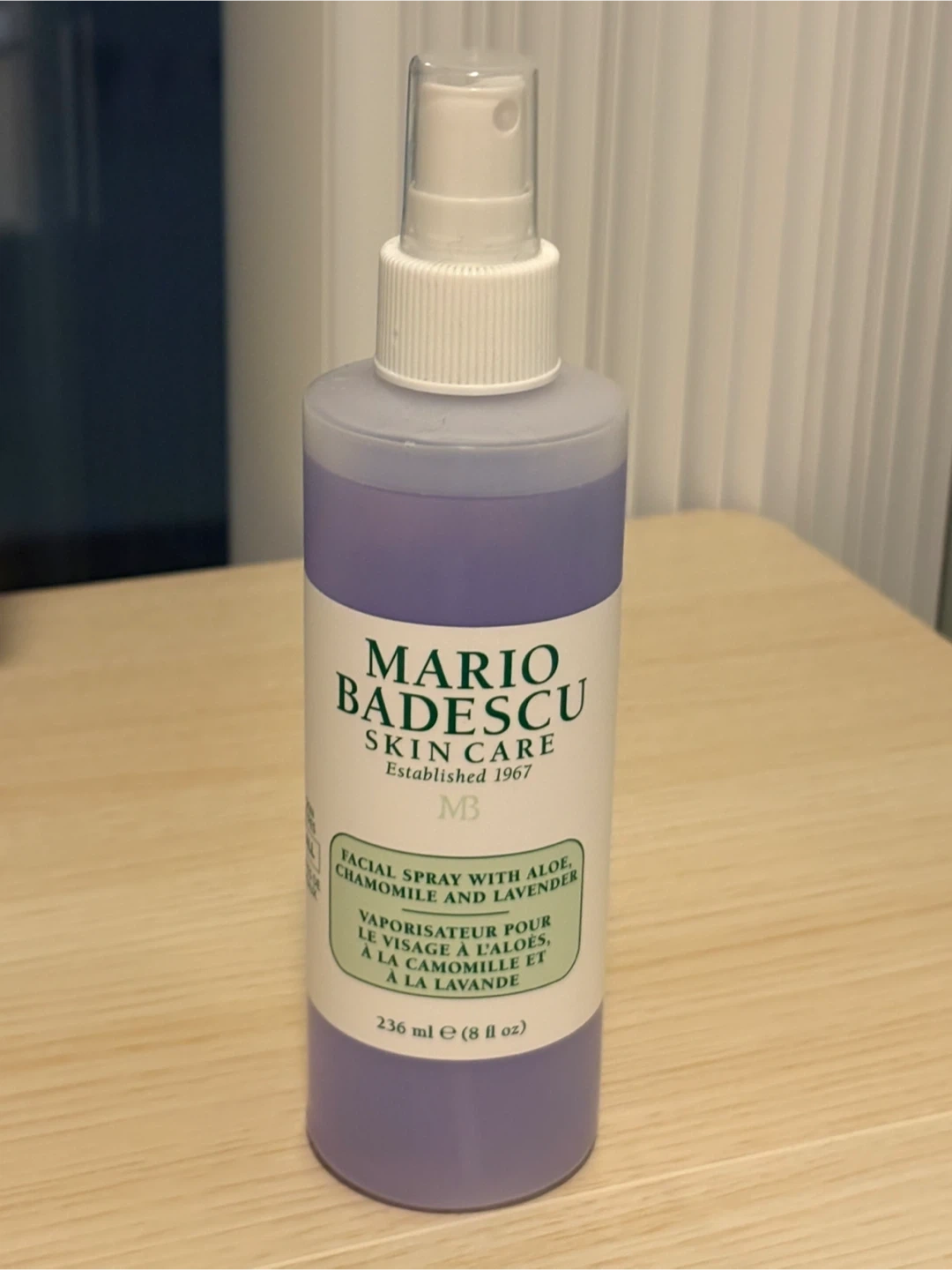 A brand new bottle of Mario Badescu facial spray with aloe, chamomile, and lavender.