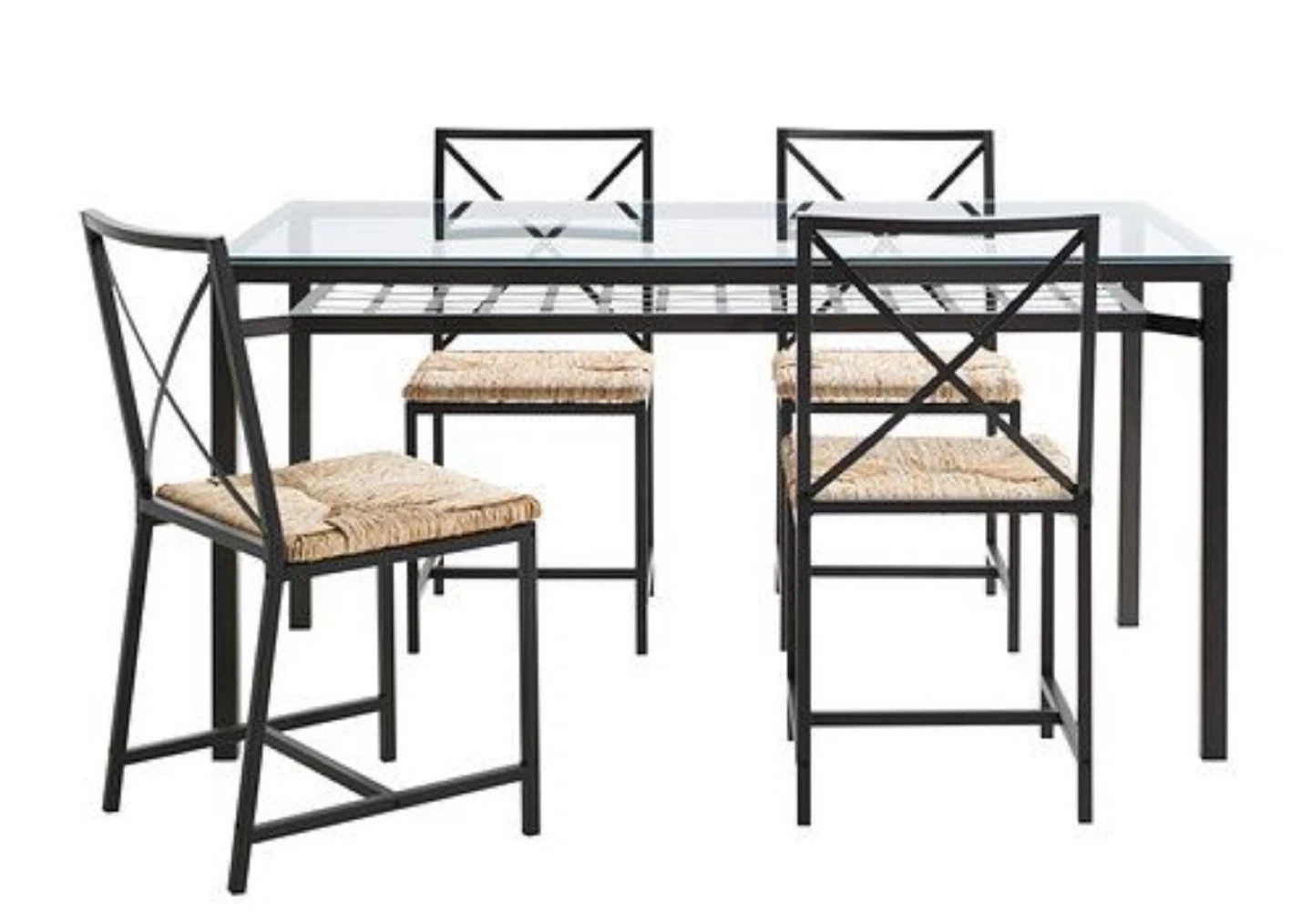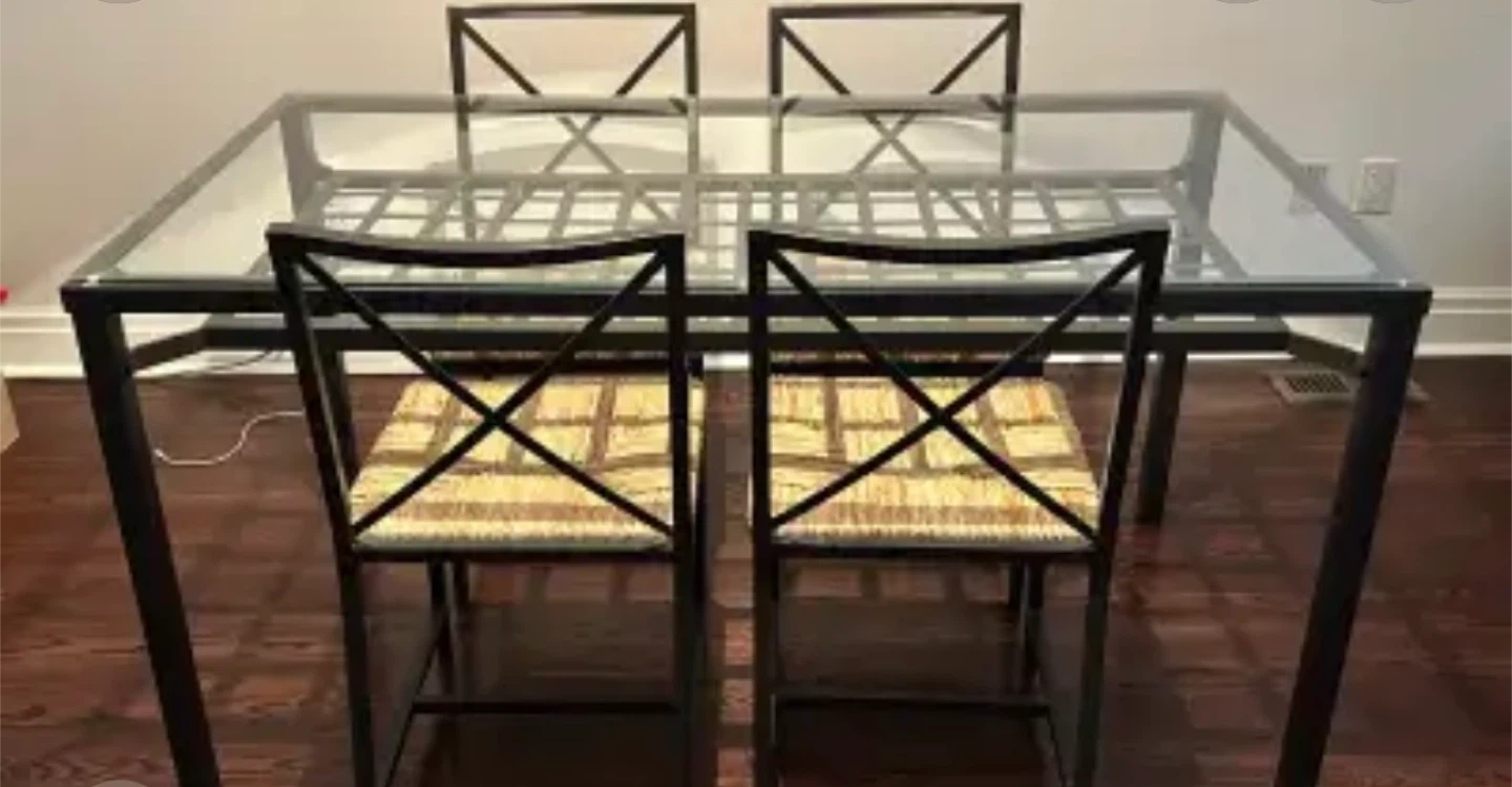 Selling a dining table with a glass top and four matching chairs. The chairs have a woven seat that adds a nice touch. It's a great set for a smaller dining space or kitchen. The table and chairs are in good condition and ready for a new home!