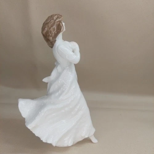 Beautiful and elegant Royal Doulton “Forget-Me-Not” bone china figurine, hand made and hand decorated in England. This graceful young woman in a flowing white gown is captured in a soft, romantic pose, reflecting Royal Doulton’s classic figurative style and fine craftsmanship.