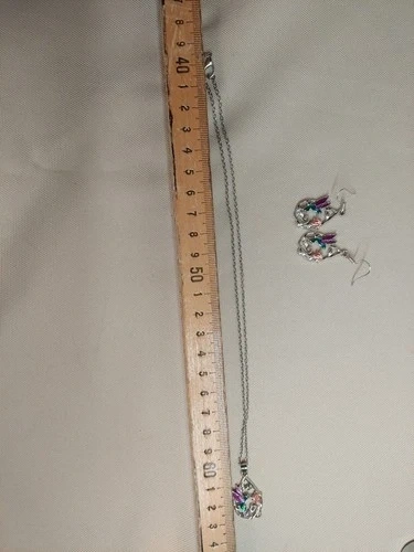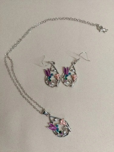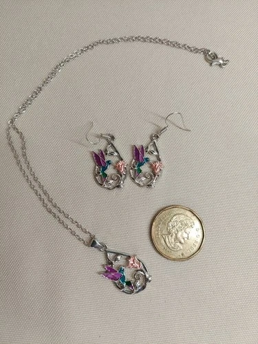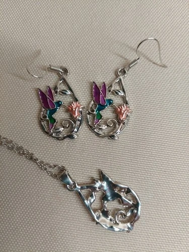 Item# 0028 Beautiful hummingbird and floral necklace and earrings set featuring colorful enamel detailing in shades of purple, teal, and coral. The design captures a hummingbird in flight, framed in silver-tone metal for a bright, nature-inspired look. This is modern artisan-style jewelry (not vintage and not designer couture), similar to pieces commonly found in gift shops, artisan markets, and museum-style stores. It’s lightweight, wearable, and full of charm—perfect for everyday wear or gifting. The necklace hangs from a delicate cable chain with a lobster clasp, while the matching earrings feature comfortable fish hook backs. A lovely coordinated set that offers better value than purchasing pieces individually.Details Set Includes: Necklace and matching earrings Motif: Hummingbird and flower Materials: Silver-tone metal, cold enamel Chain: Lightweight cable chain with lobster clasp Earrings: Fish hook style Era: Late 1990s–2010s Origin: Likely artisan/import production (Mexico / Thailand / Bali-style) Hallmarks: No designer name or sterling marks presentMeasurements (Approx.) Necklace length: See photos with ruler Pendant size: See close-up photos Earrings: Scale shown in photos (coin used for reference) 📸 Please review all photos for exact size and condition.Perfect For Hummingbird lovers Nature & garden jewelry fans Gift giving Casual everyday wear Boho or festival stylePlease Note This set is NOT sterling silver This set is NOT vintage designer jewelry This set is NOT signed Any minor patina or wear is consistent with normal use