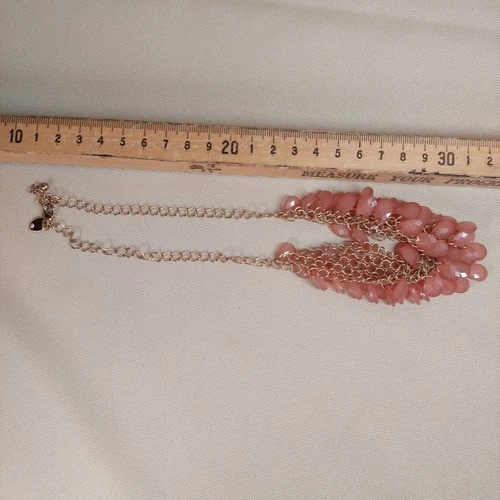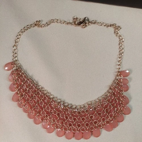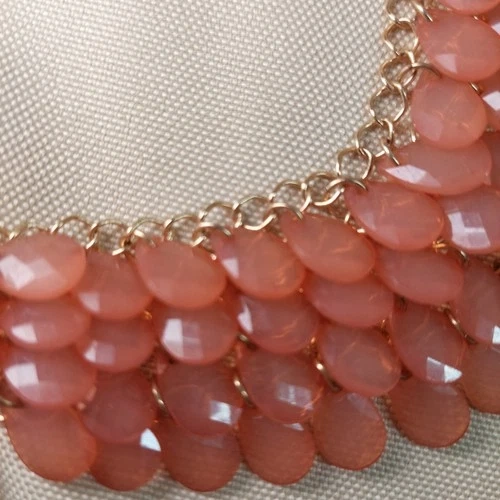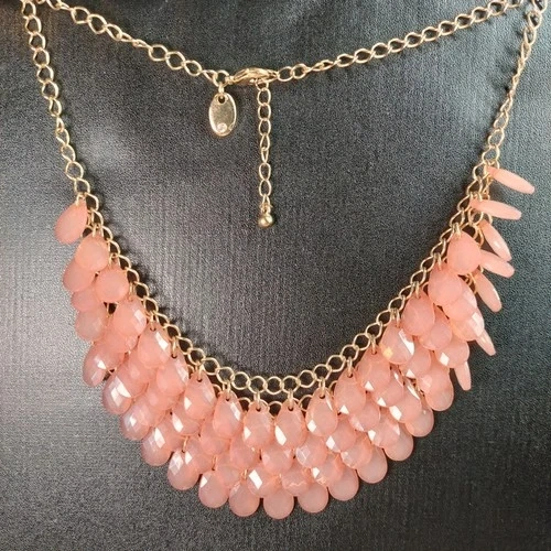 Stylish statement necklace featuring layered faceted pink teardrop beads made of plastic/acrylic, set on a gold-tone chain. Lightweight and comfortable, this bib-style necklace adds a bold pop of color and sparkle to any outfit.