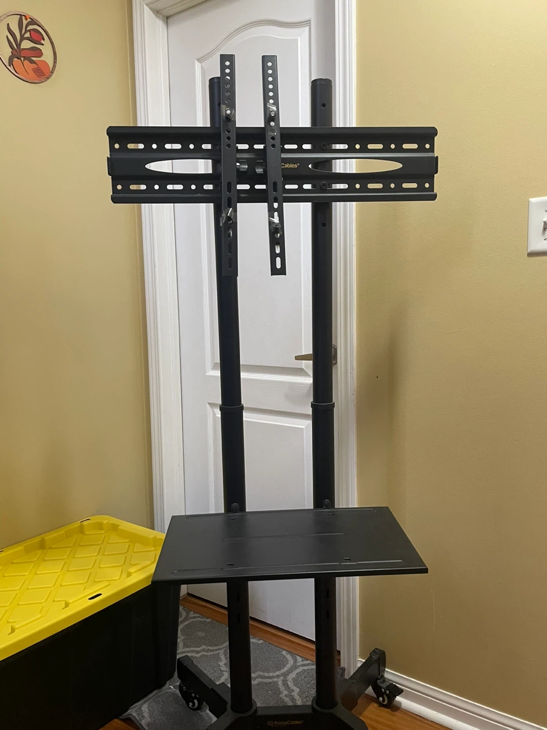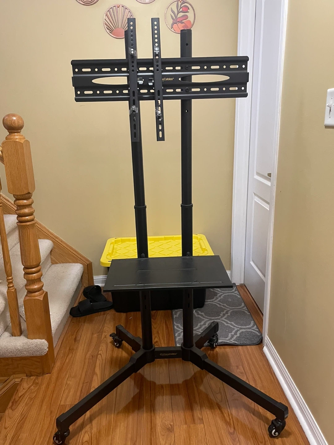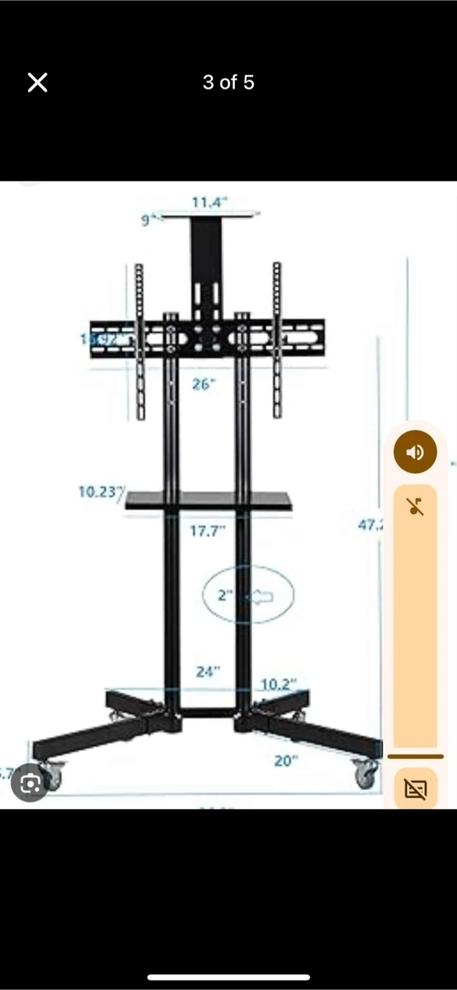 Selling a rolling TV stand with a mount. It's in great shape and ready to use! The stand is black and has a shelf for media devices. It's easy to move around thanks to the wheels. Perfect for a living room, bedroom, or office!
