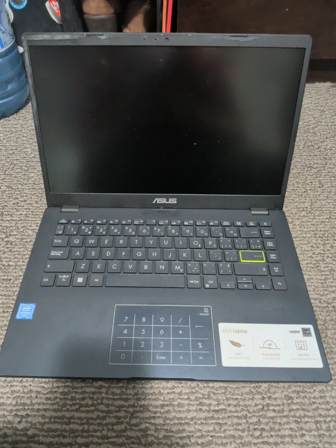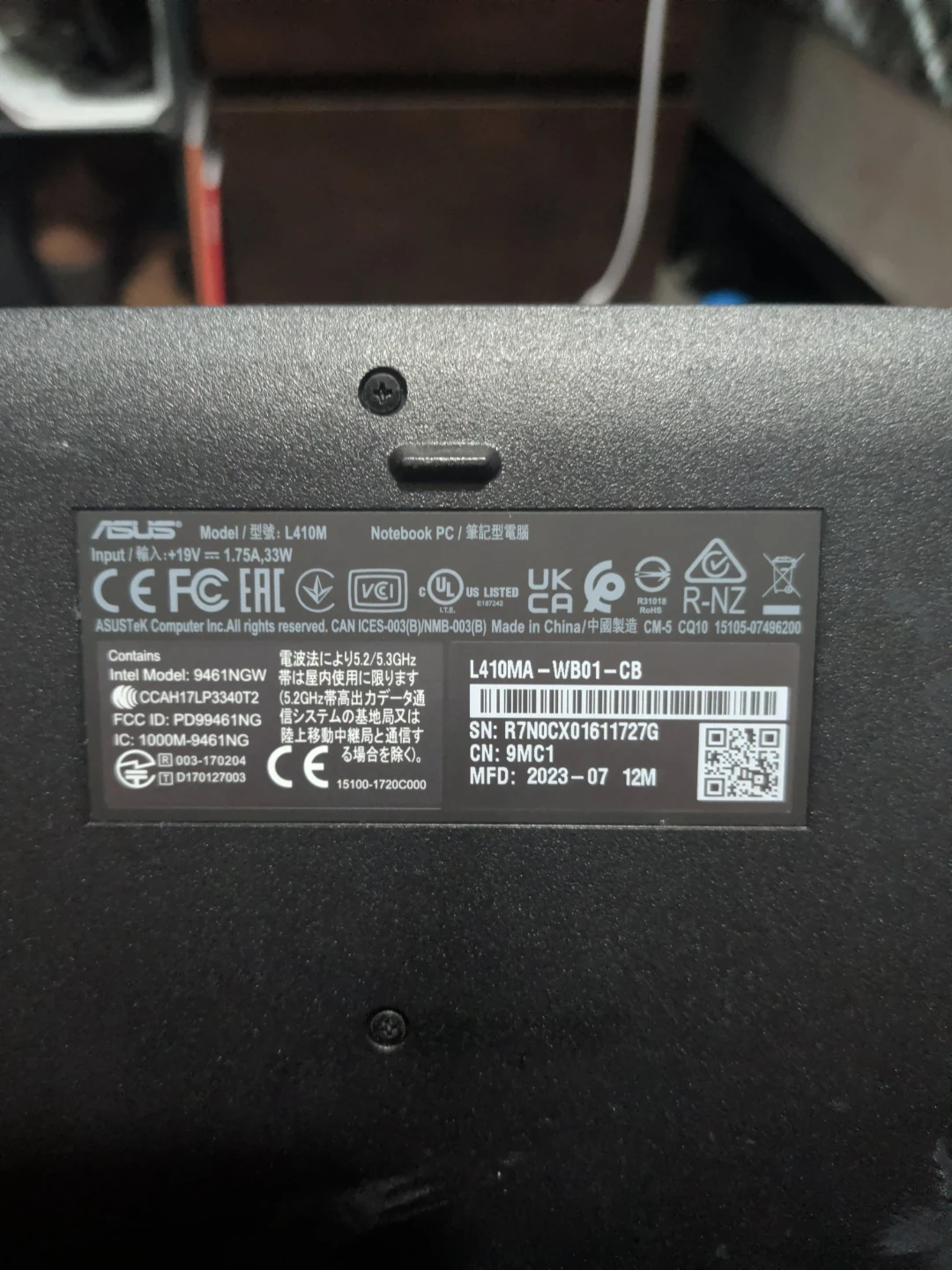 Selling an ASUS laptop, model L410M. The manufacturing date is 2023 July 12.