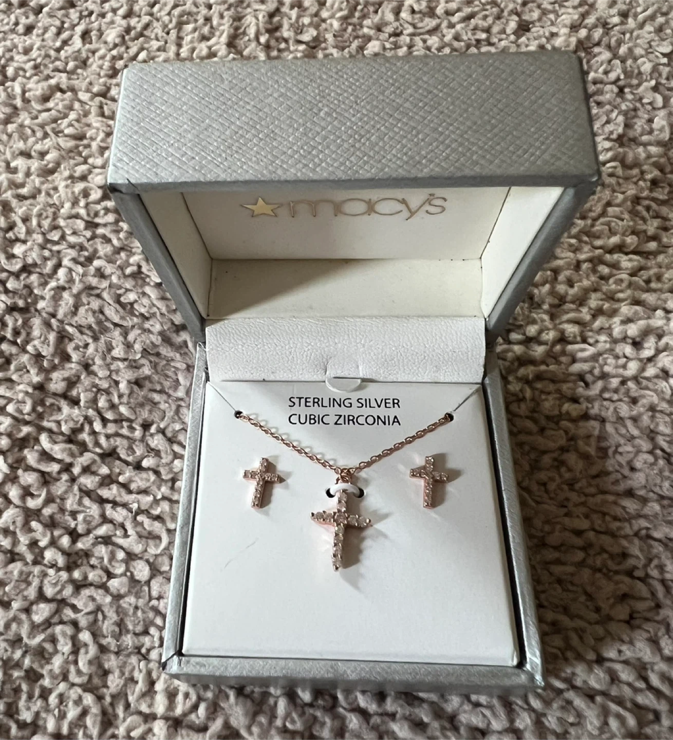 Buy & SellMacy's Sterling Silver Cubic Zirconia Cross SetMacy's Sterling Silver Cubic Zirconia Cross Set$55I'm selling a Macy's sterling silver necklace and earring set. It features a cross design with cubic zirconia. It comes in the original box.ConditionNewBrandMacy'sWHERE TO MEETKingsbridge HeightsView MapSELLERverifiedGinez AUniversity Heights842 reviews0 chats·0 favorites·36 viewsSEND CHAT TO SELLERHi Ginez A! I’m interested in your listing.Hi Ginez A! I’m interested in your listing.Get the Karrot app to chatSign In to chat