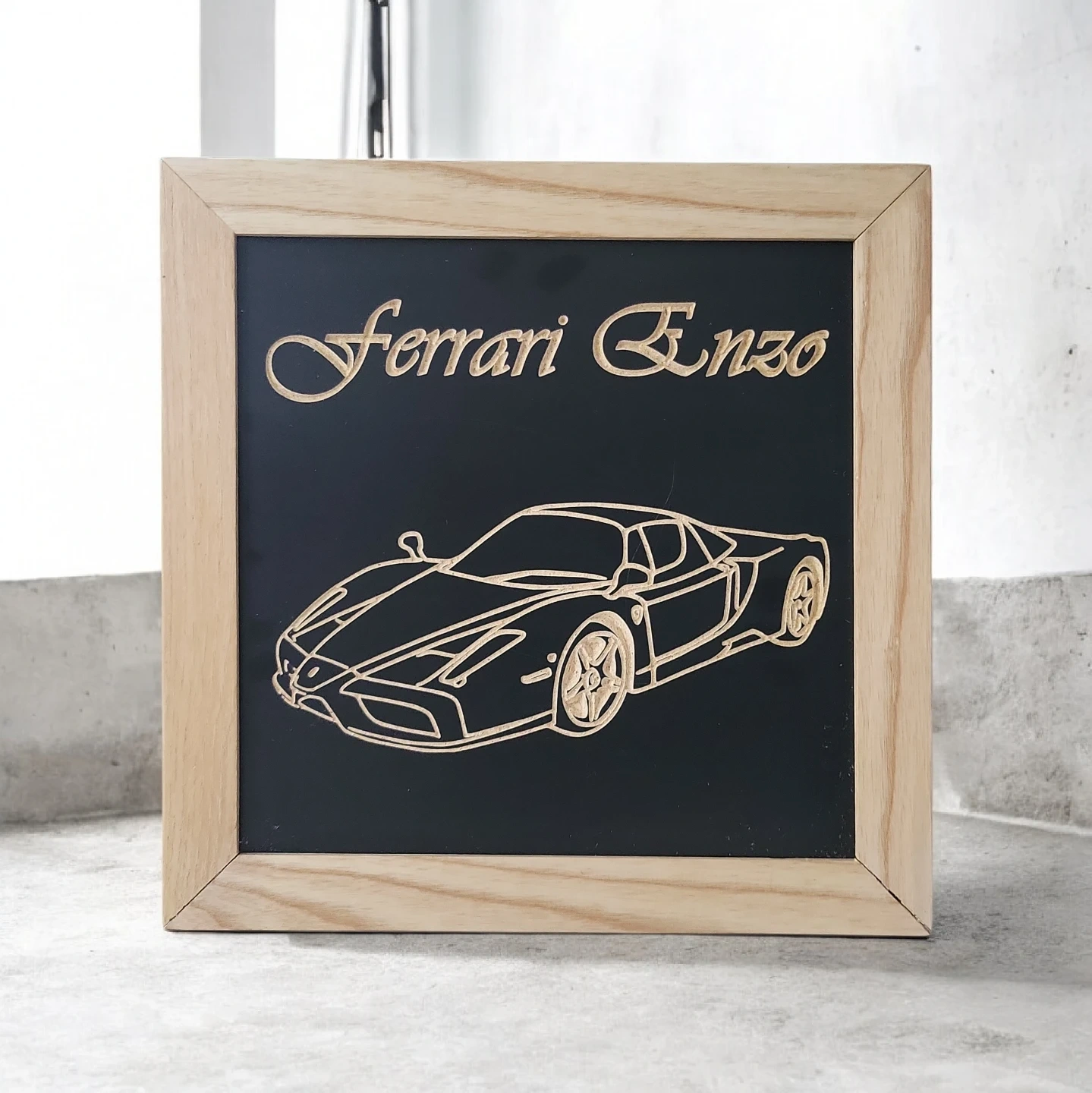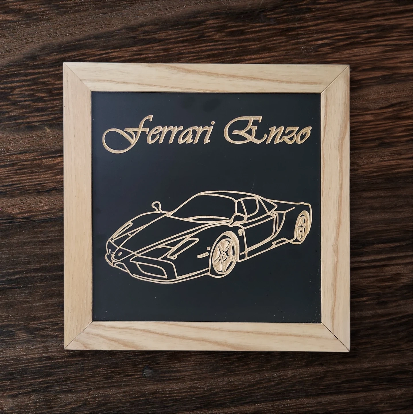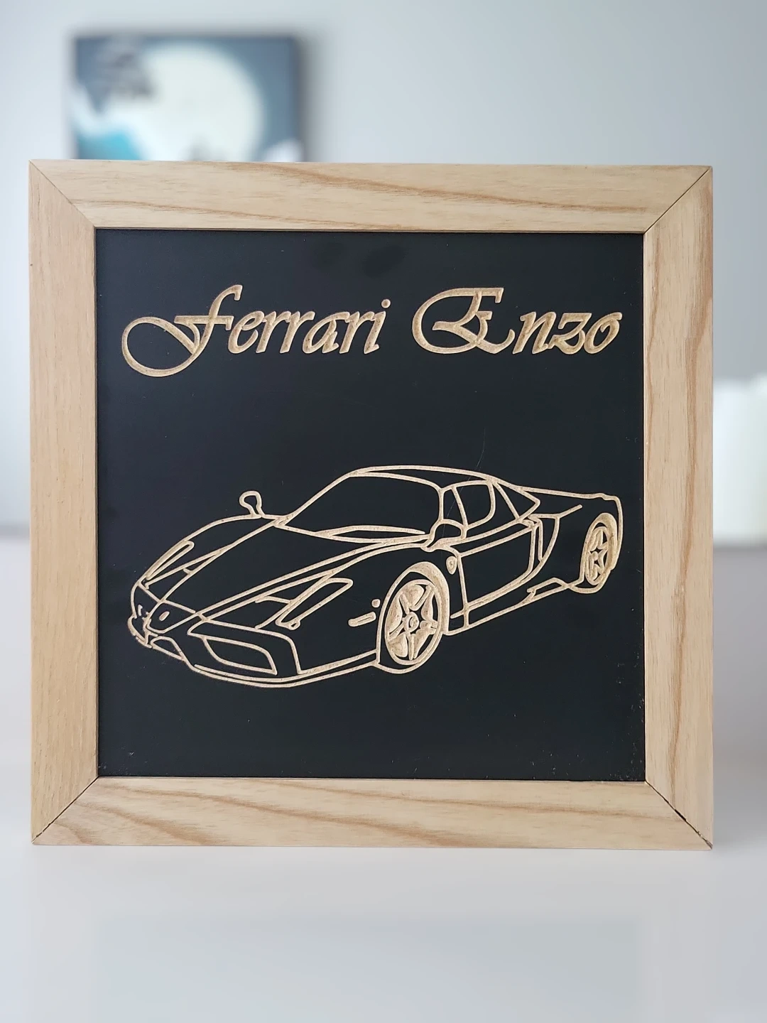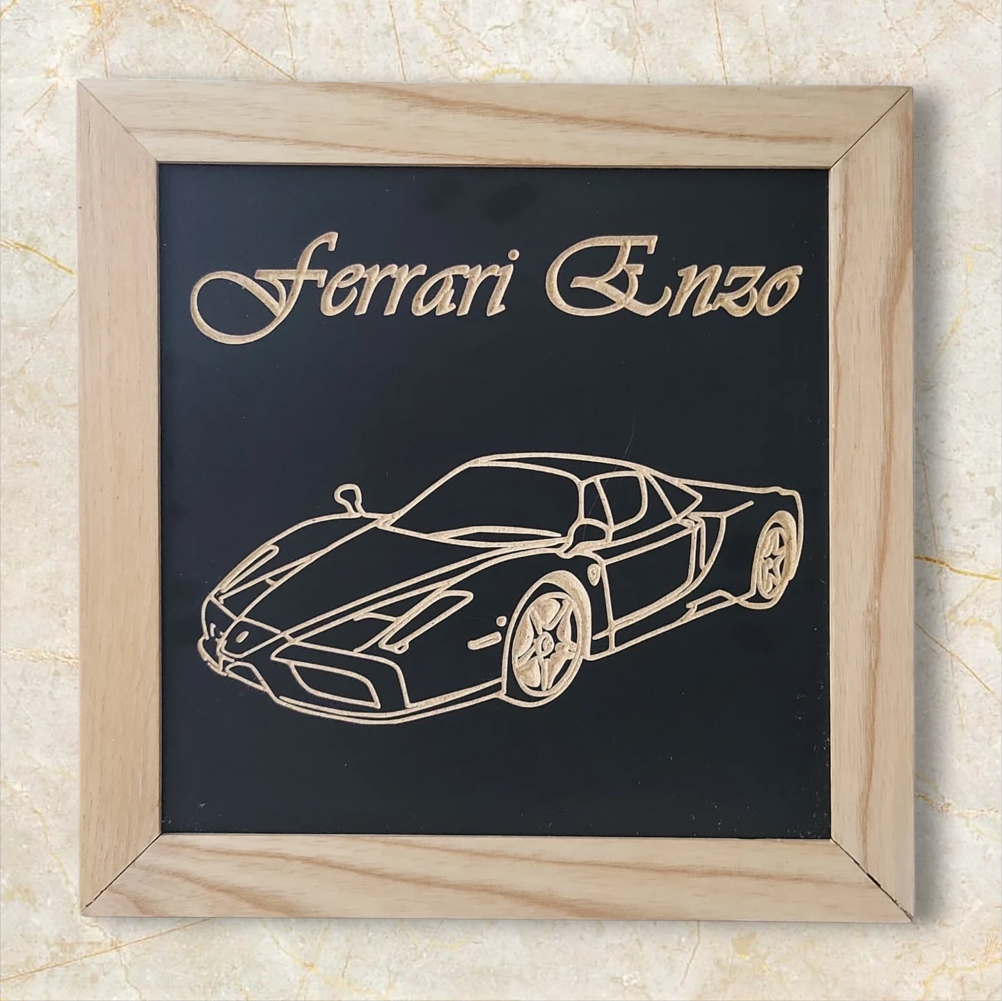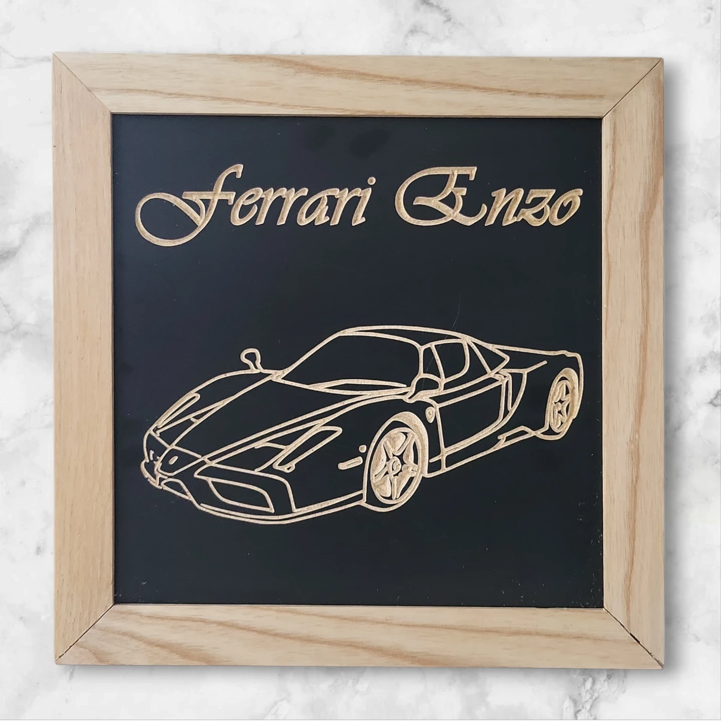 Here's a lovely piece of wall art featuring a Ferrari Enzo design. It's a wooden framed piece that would look great in any car enthusiast's space!