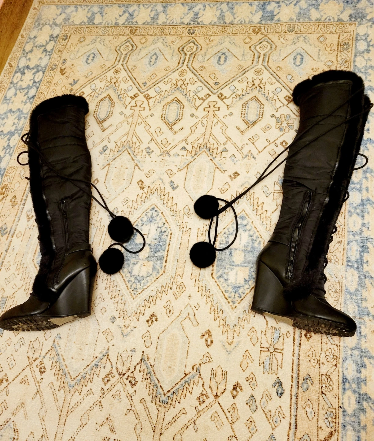Selling a pair of stylish black over-the-knee wedge boots! They feature a unique design with fur trim and pom-pom details. Perfect for adding a touch of flair to your winter wardrobe. Has anti slip on bottom of feet for extra protection. Very comfy to walk in. Selling due to closet clean out haul. Need to reduce items.